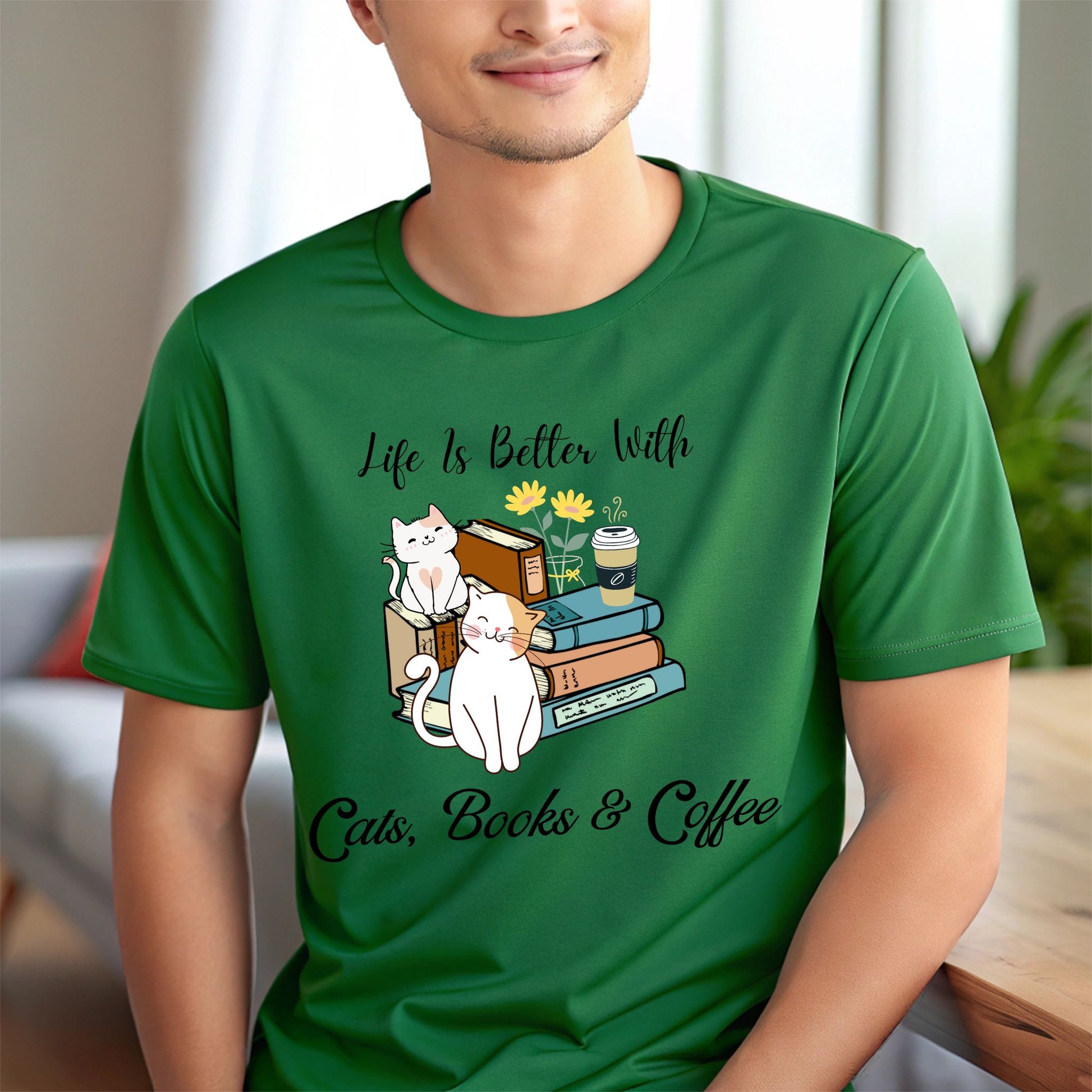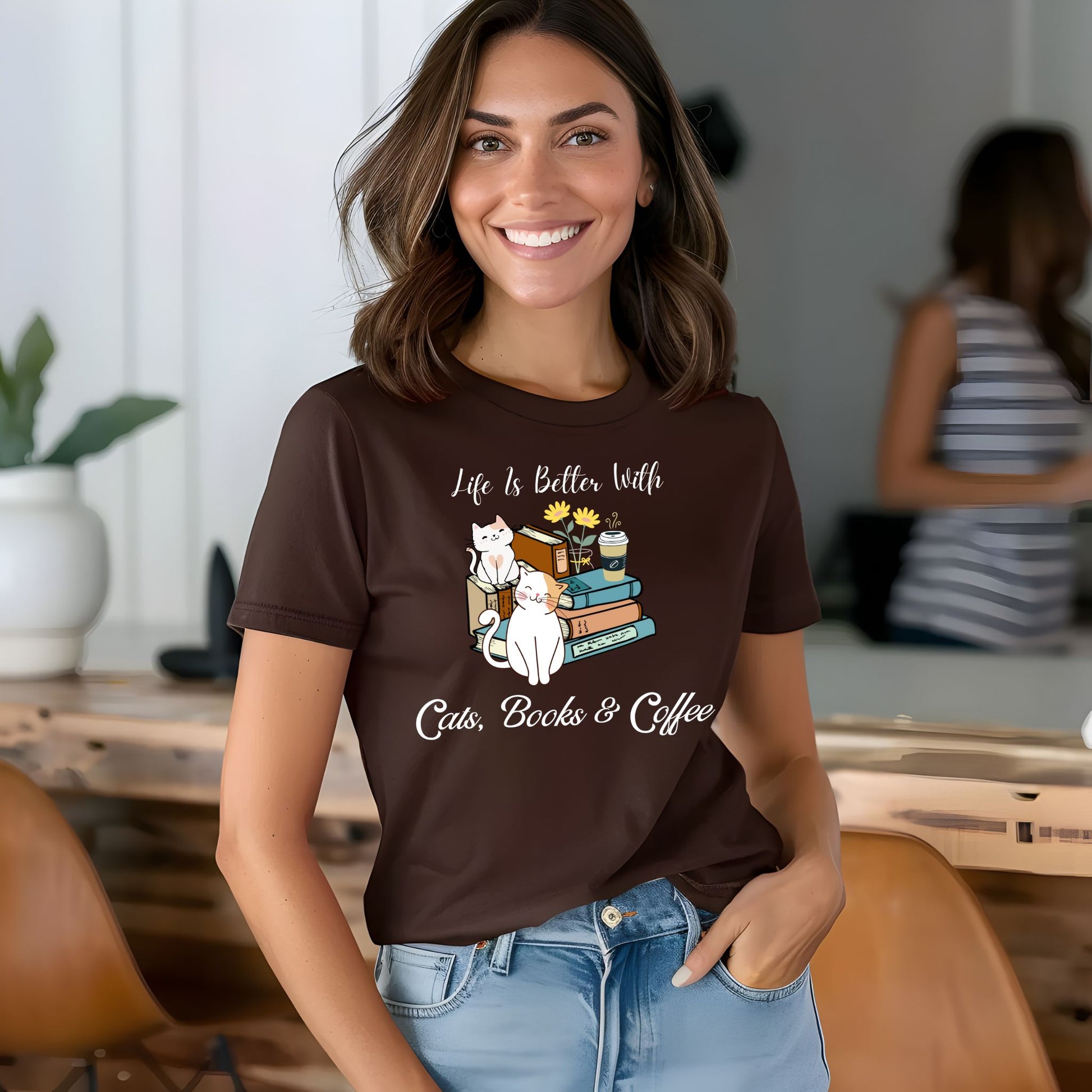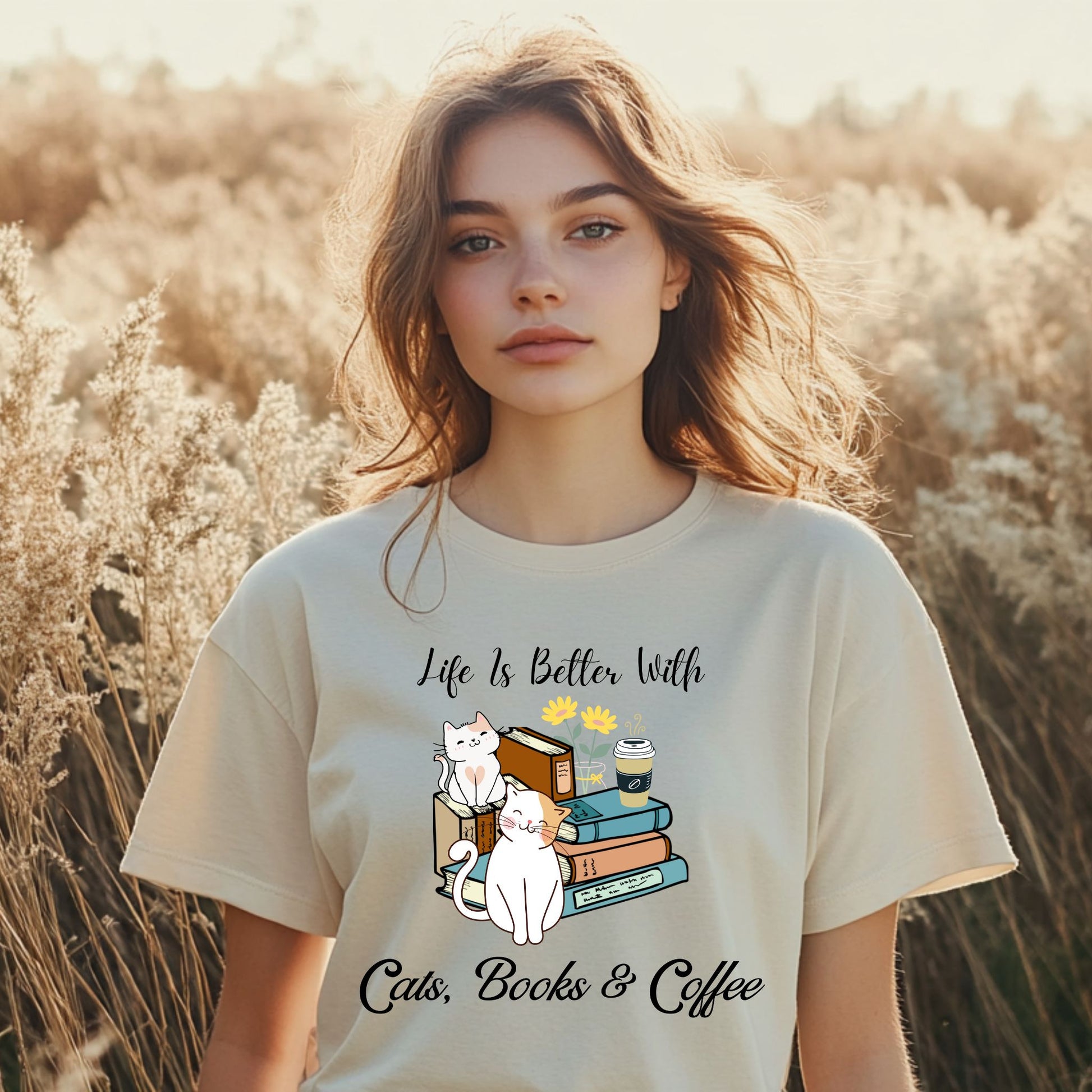 Life’s Better with Cats, Books, and Coffee T-Shirt – Cute Cat & Book Lover Graphic Tee
