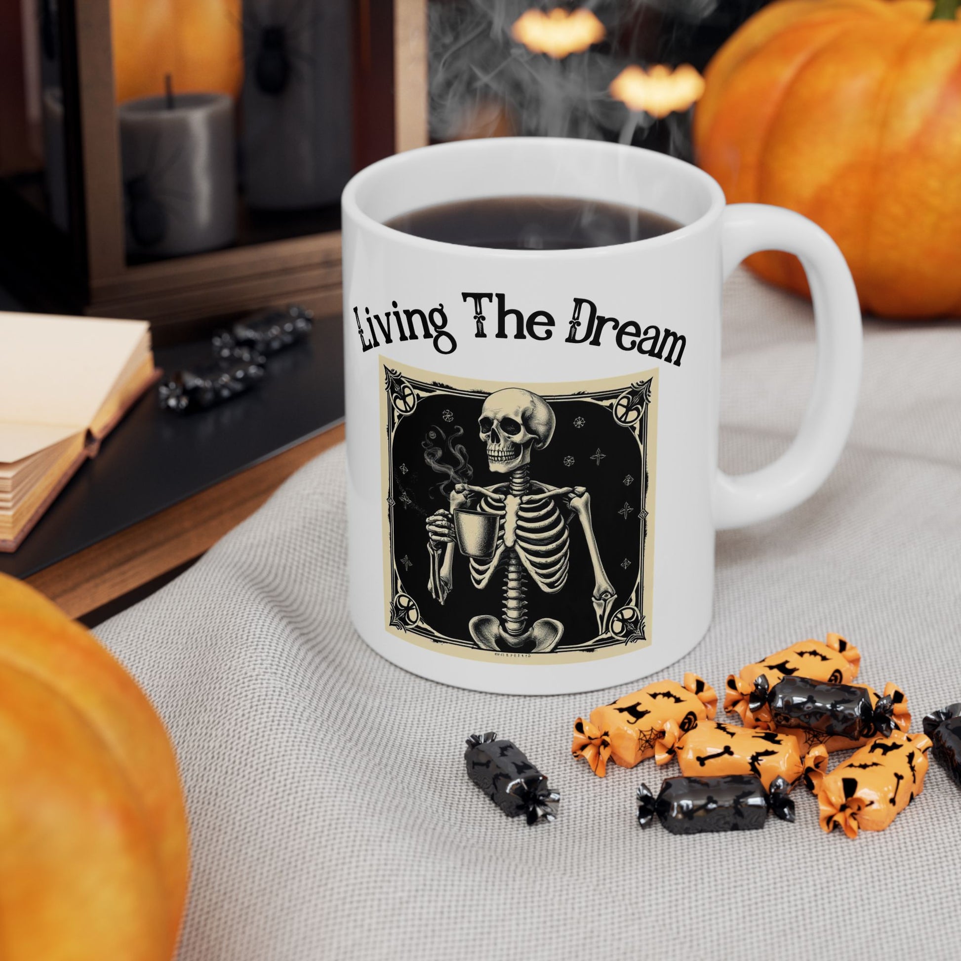 A ceramic mug featuring a skeleton holding a steaming cup of coffee with text 'living the dream'. This mug gives off a cozy and quirky vibe, perfect for coffee lovers looking to start their day with a smile. Ideal for Halloween enthusiasts and anyone who loves a unique twist on their morning routine.