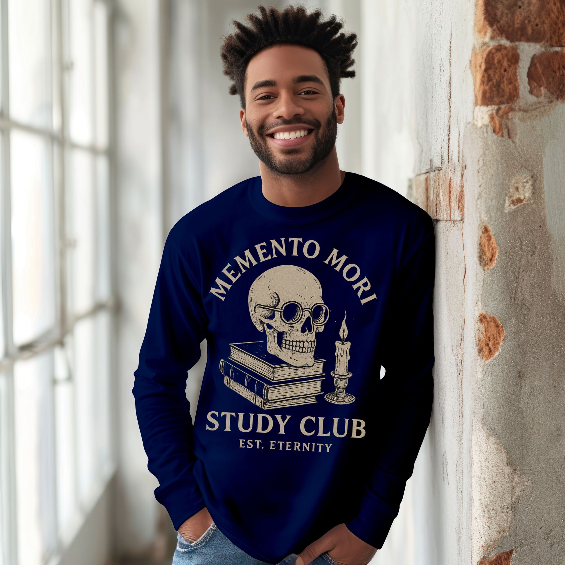 This Memento Mori Study Club long sleeve tee is the perfect blend of gothic intellect and dark academia vibes. Featuring a scholarly skull in glasses, stacked antique books, and a flickering candle, this design whispers "philosophy, mortality, and probably way too much Latin."