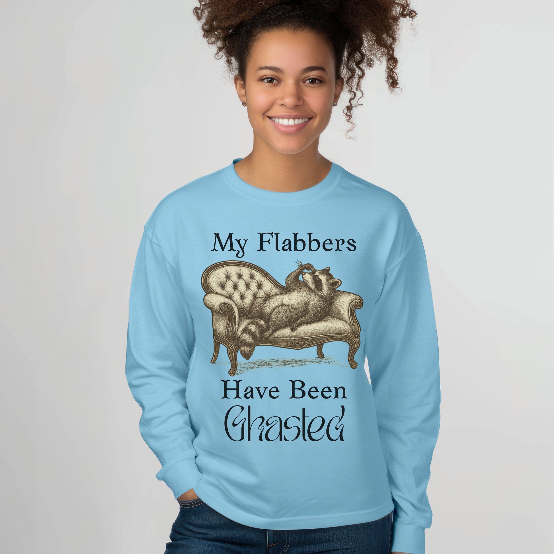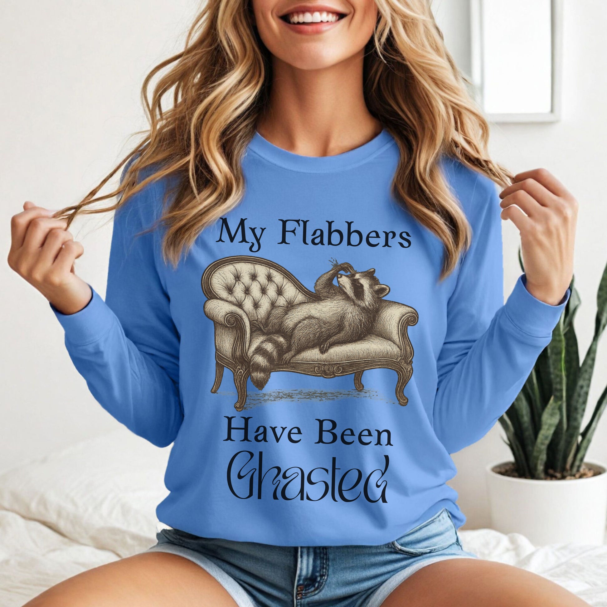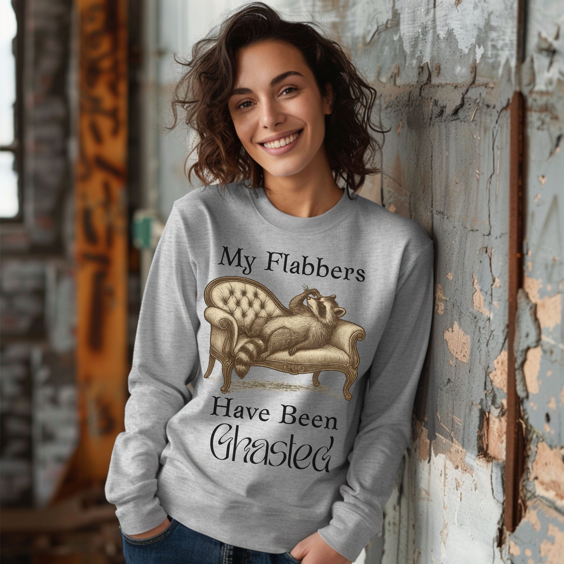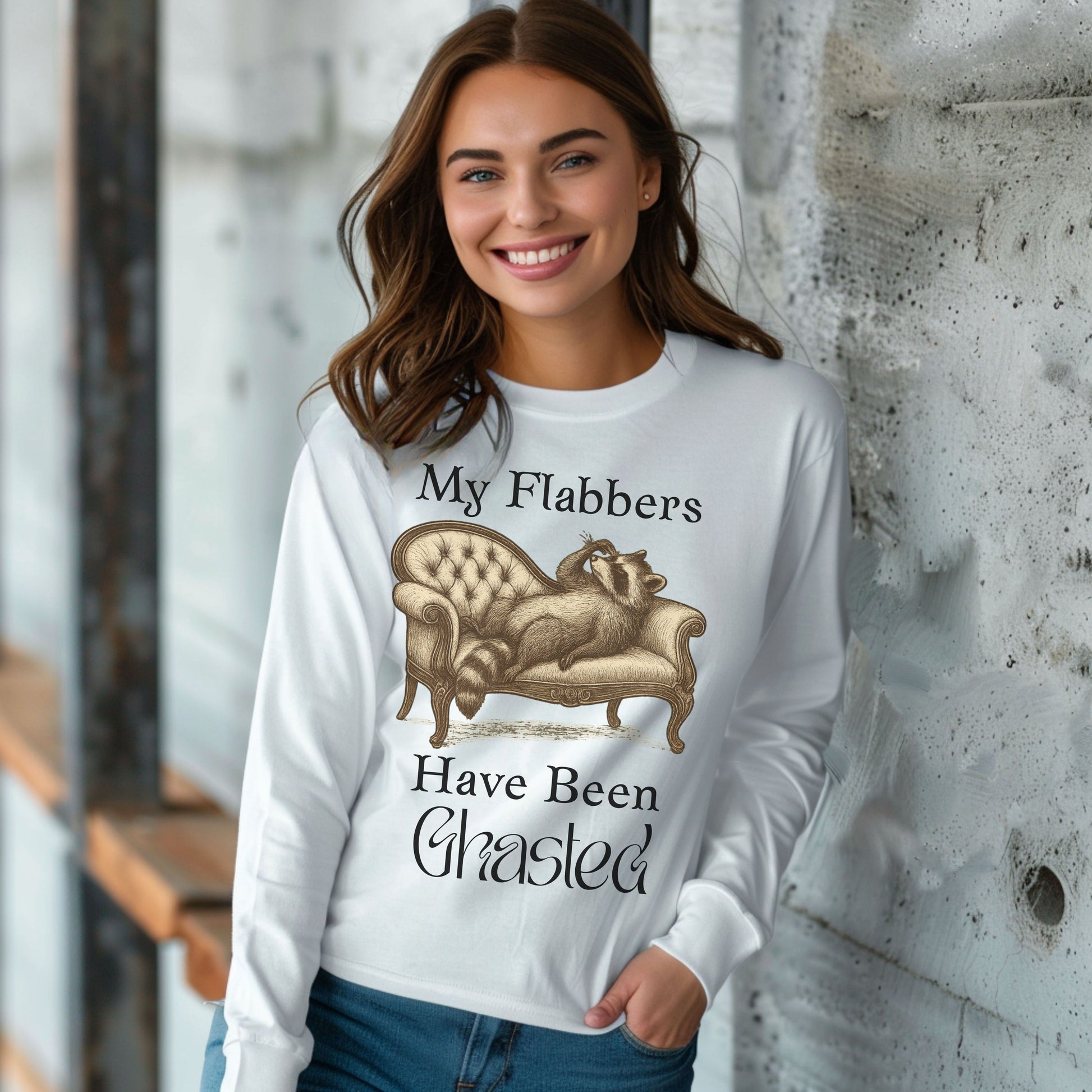 Feeling dramatically overwhelmed by... well, everything? Same. This “My Flabbers Have Been Ghasted” t-shirt captures that perfect blend of sarcasm, exhaustion, and vintage flair. Featuring a relaxed raccoon draped across a Victorian fainting couch, this retro-style graphic long sleeve tee is ideal for introverts, overstimulated extroverts, and anyone who thrives on dry humor.