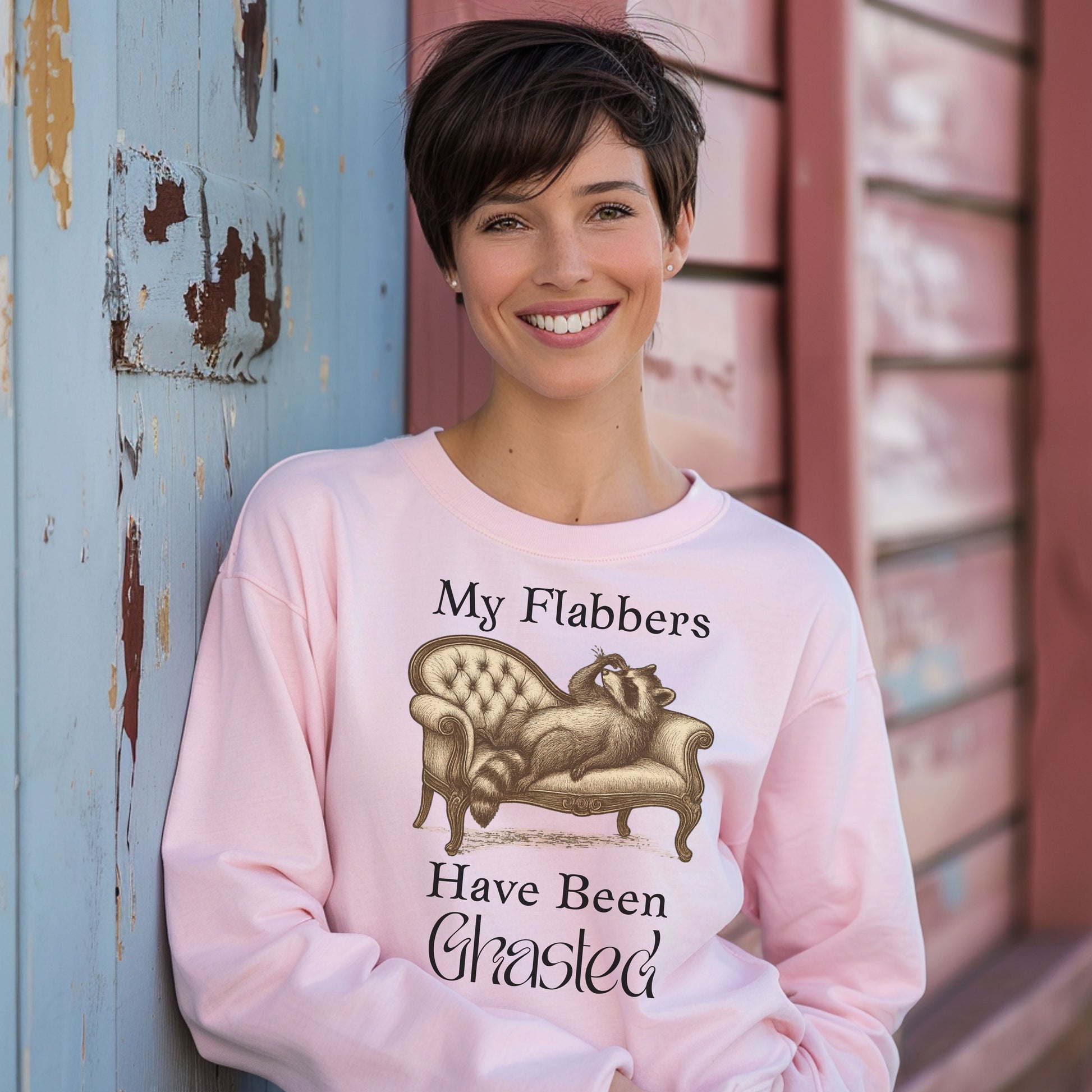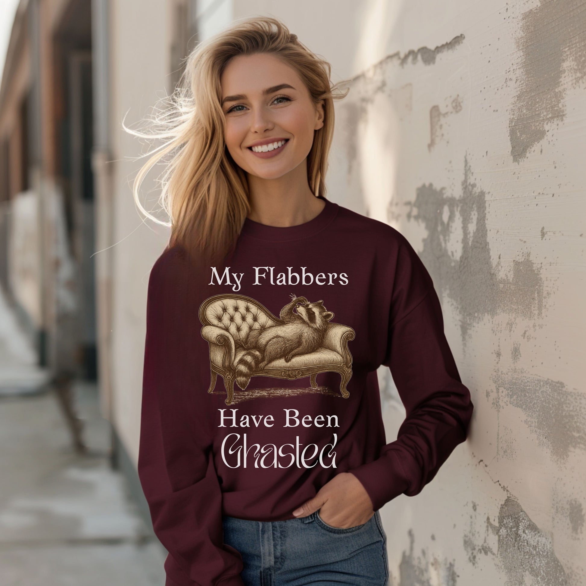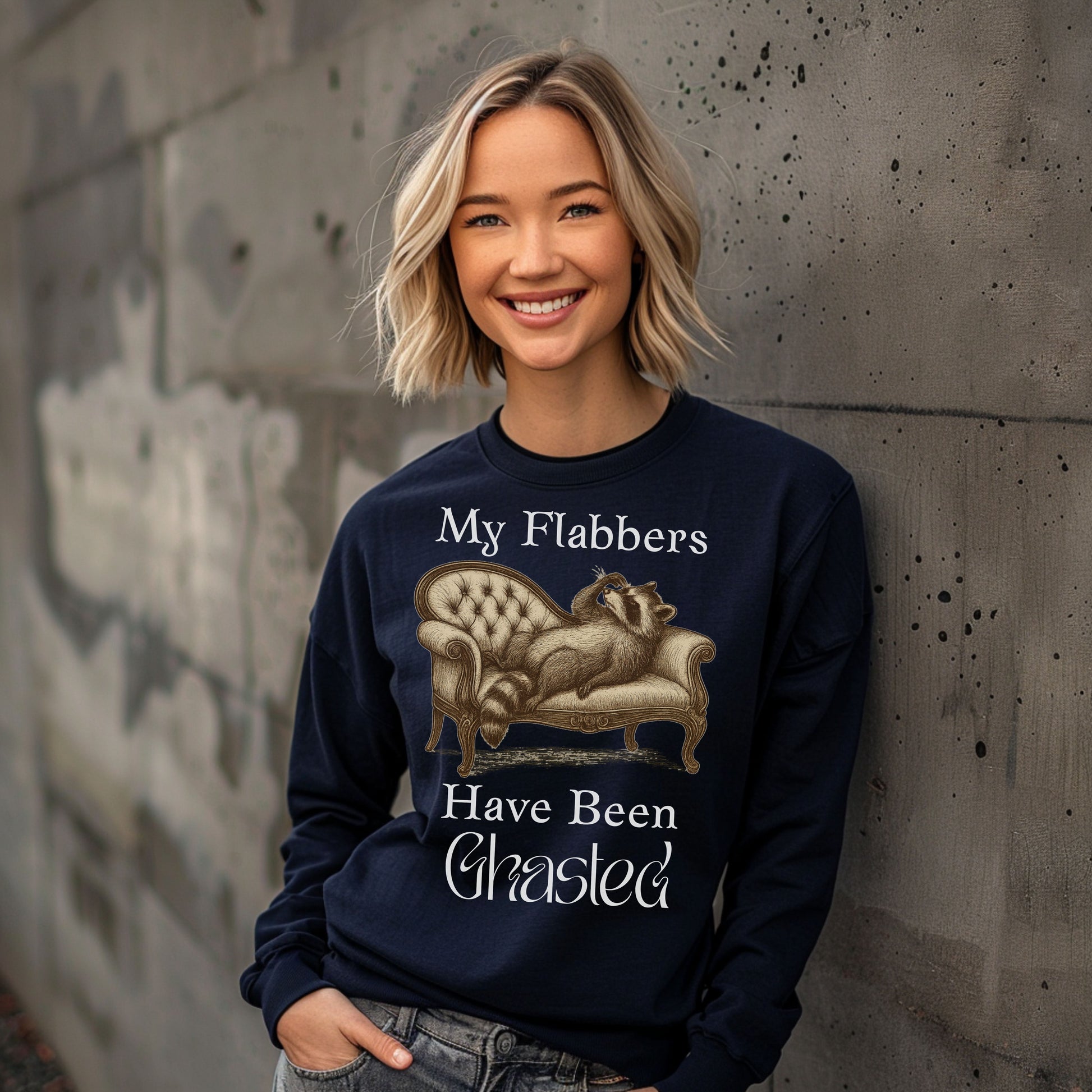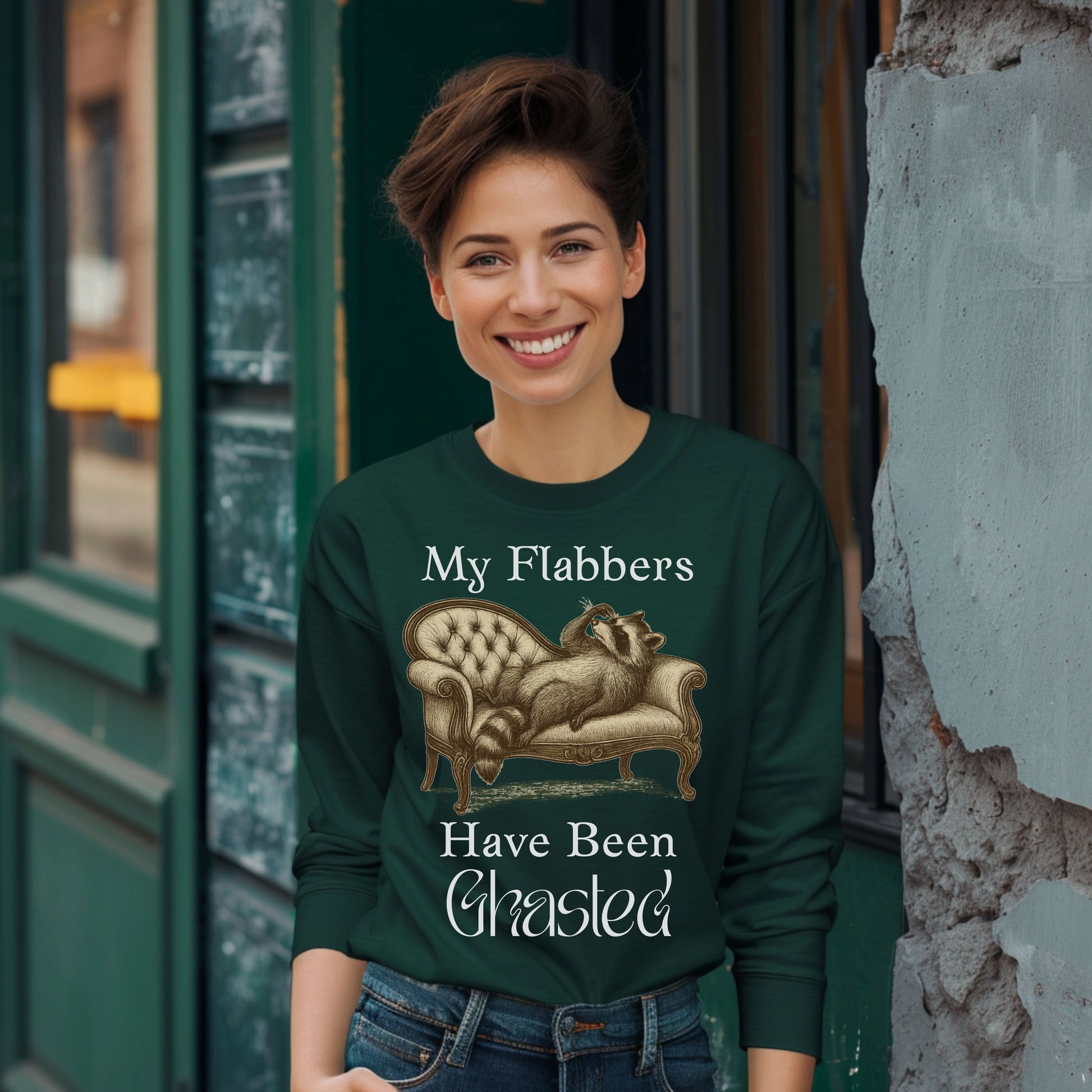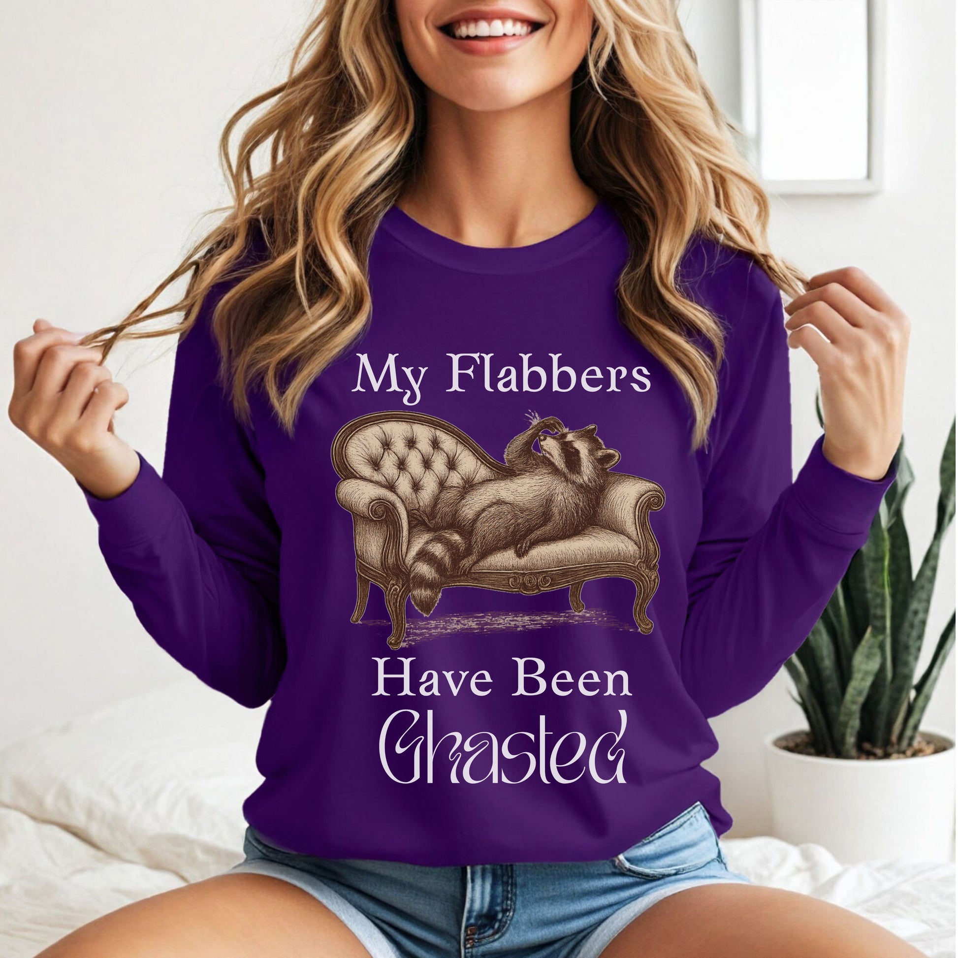 Feeling dramatically overwhelmed by... well, everything? Same. This “My Flabbers Have Been Ghasted” t-shirt captures that perfect blend of sarcasm, exhaustion, and vintage flair. Featuring a relaxed raccoon draped across a Victorian fainting couch, this retro-style graphic long sleeve tee is ideal for introverts, overstimulated extroverts, and anyone who thrives on dry humor.