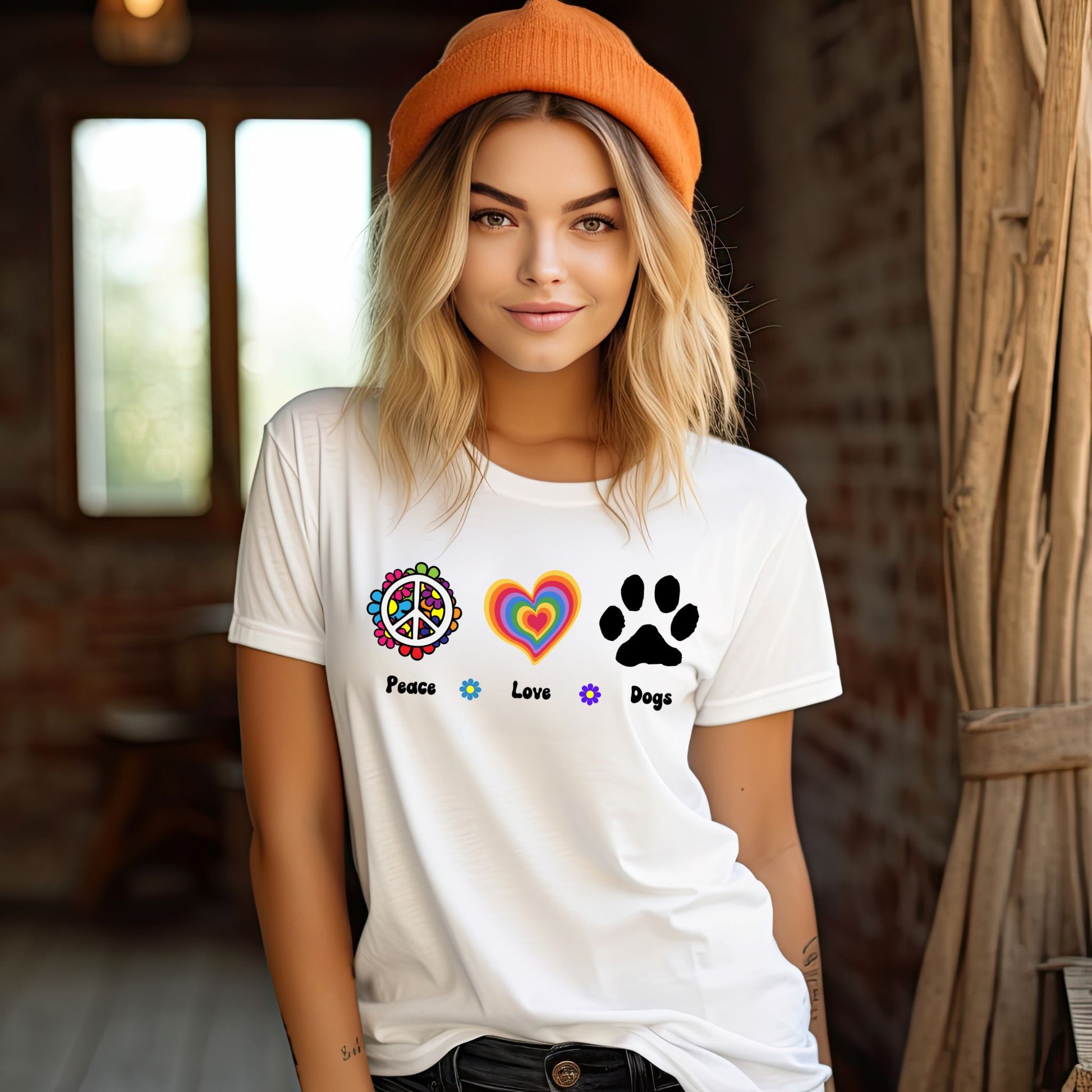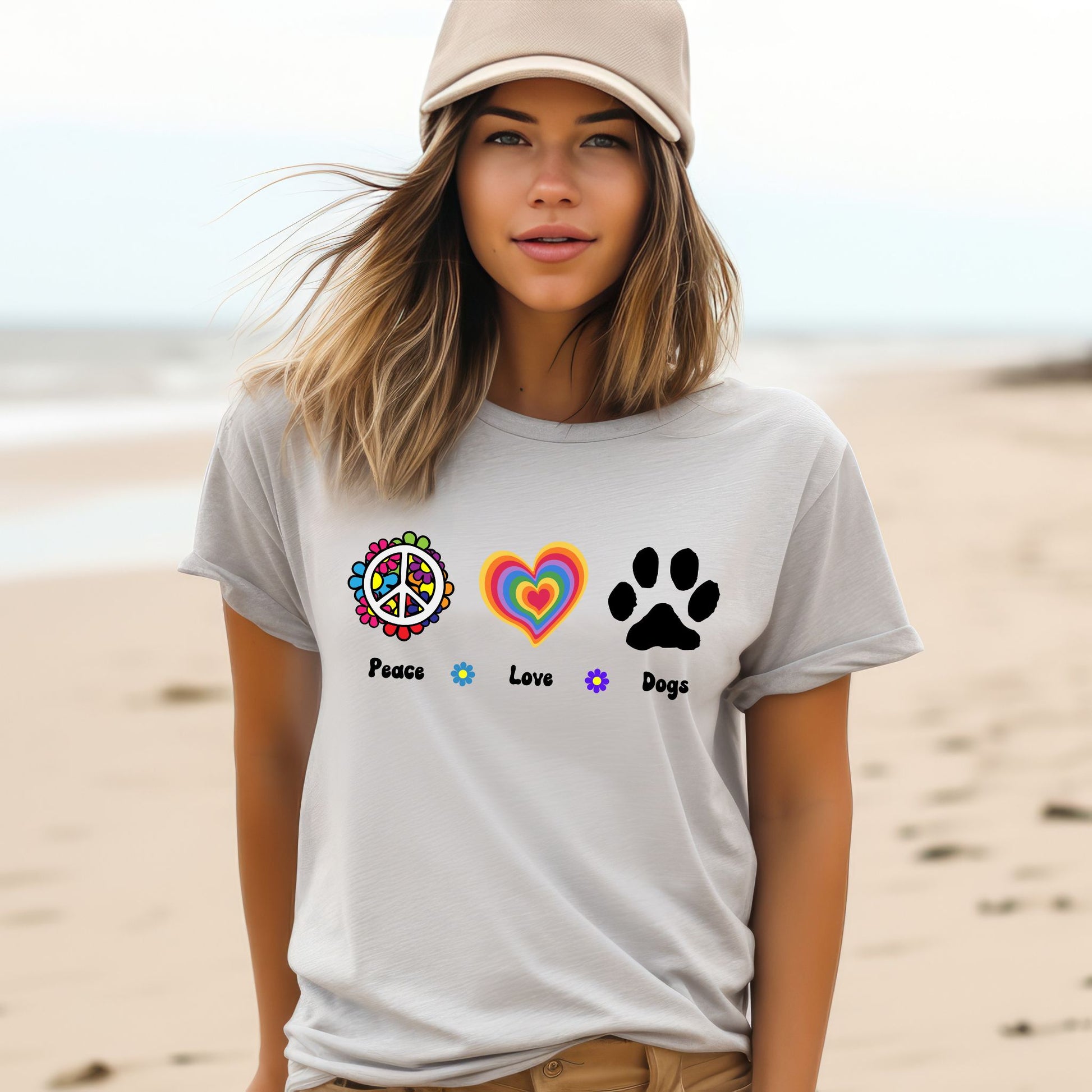 Spread good vibes and puppy love with our Peace Love & Dogs T-Shirt! Featuring a retro-style design with a peace sign, heart, and paw print, this tee is a groovy tribute to the unconditional love dogs bring into our lives. Perfect for dog moms, dog dads, or anyone who believes life is better with furry friends, this soft and comfy shirt is great for walks in the park, casual outings, or snuggles on the couch. Show off your laid-back style and dog-loving spirit in one adorable graphic tee - perfect for any retro and vintage doglover! Its vintage-inspired and retro design is sure to bring a smile to your face and let everyone know why you’re a proud dog lover! Be sure to grab yours now, so you can show off your unique style next time you're out and about! Express your love of animals and your belief in peace with this awesome vintage peace sign, heart and paw print t-shirt.