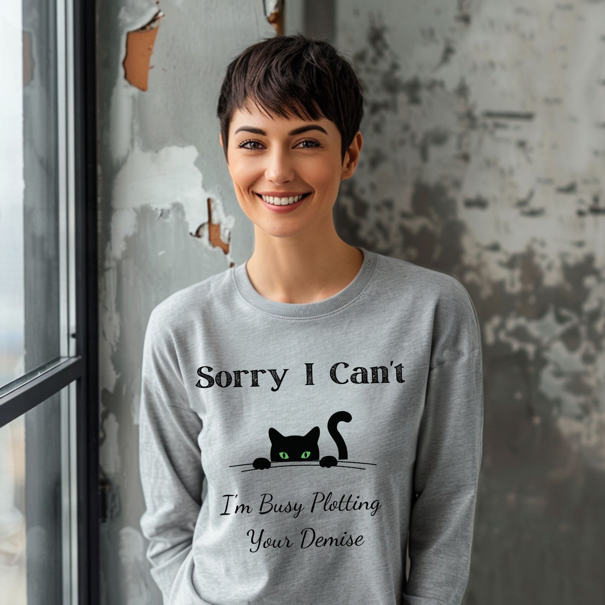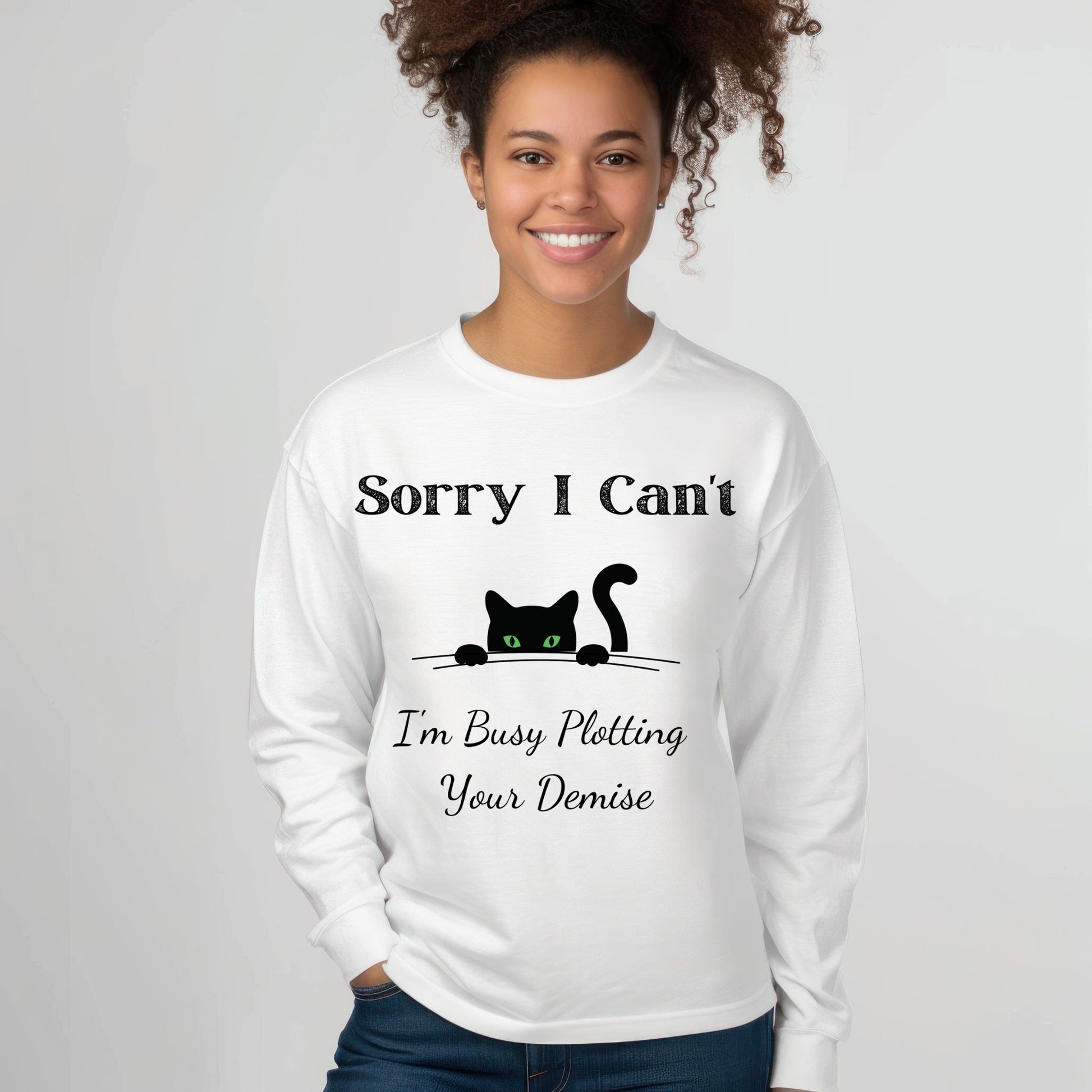 Peeking Black Cat Graphic T-Shirt Sorry I Can't I'm Plotting Your Demise Funny Cat Shirt Black Cat Tee Long Sleeve Tee