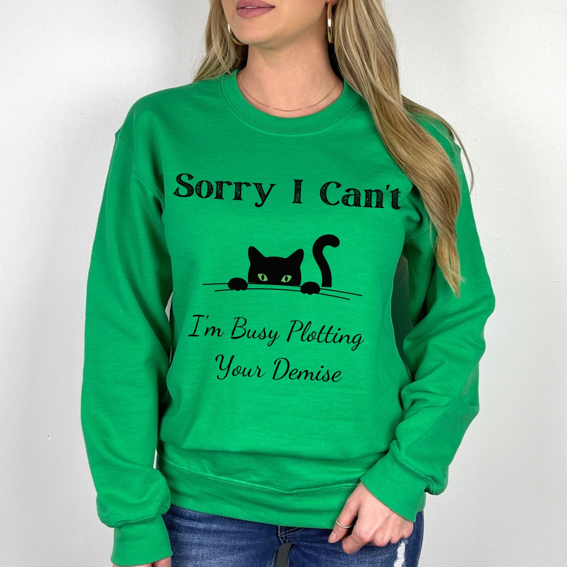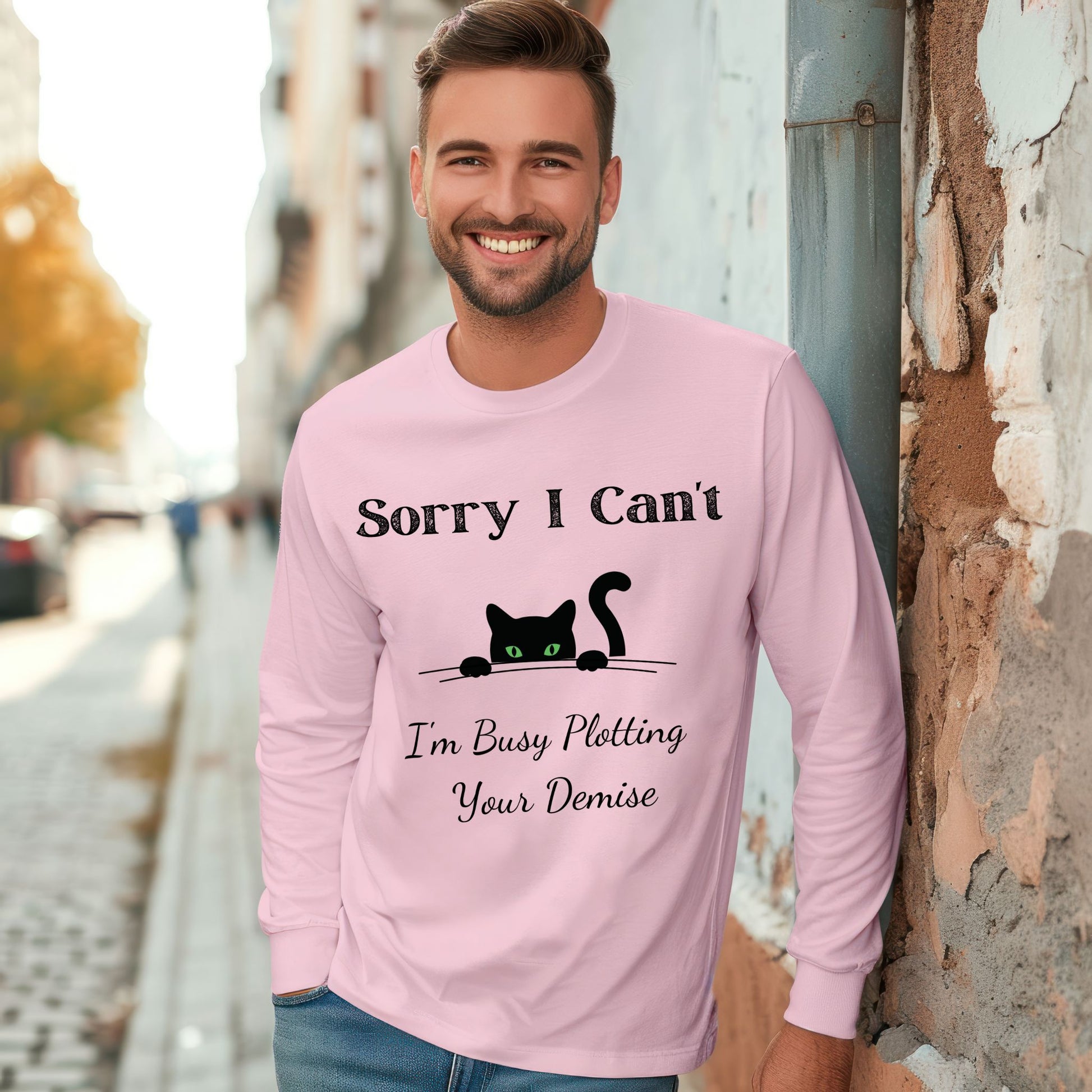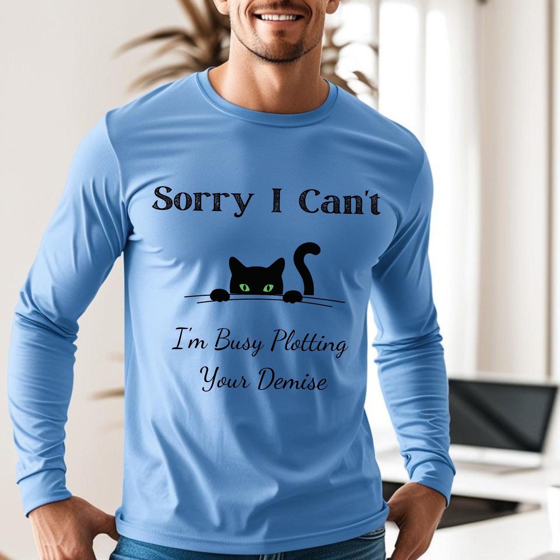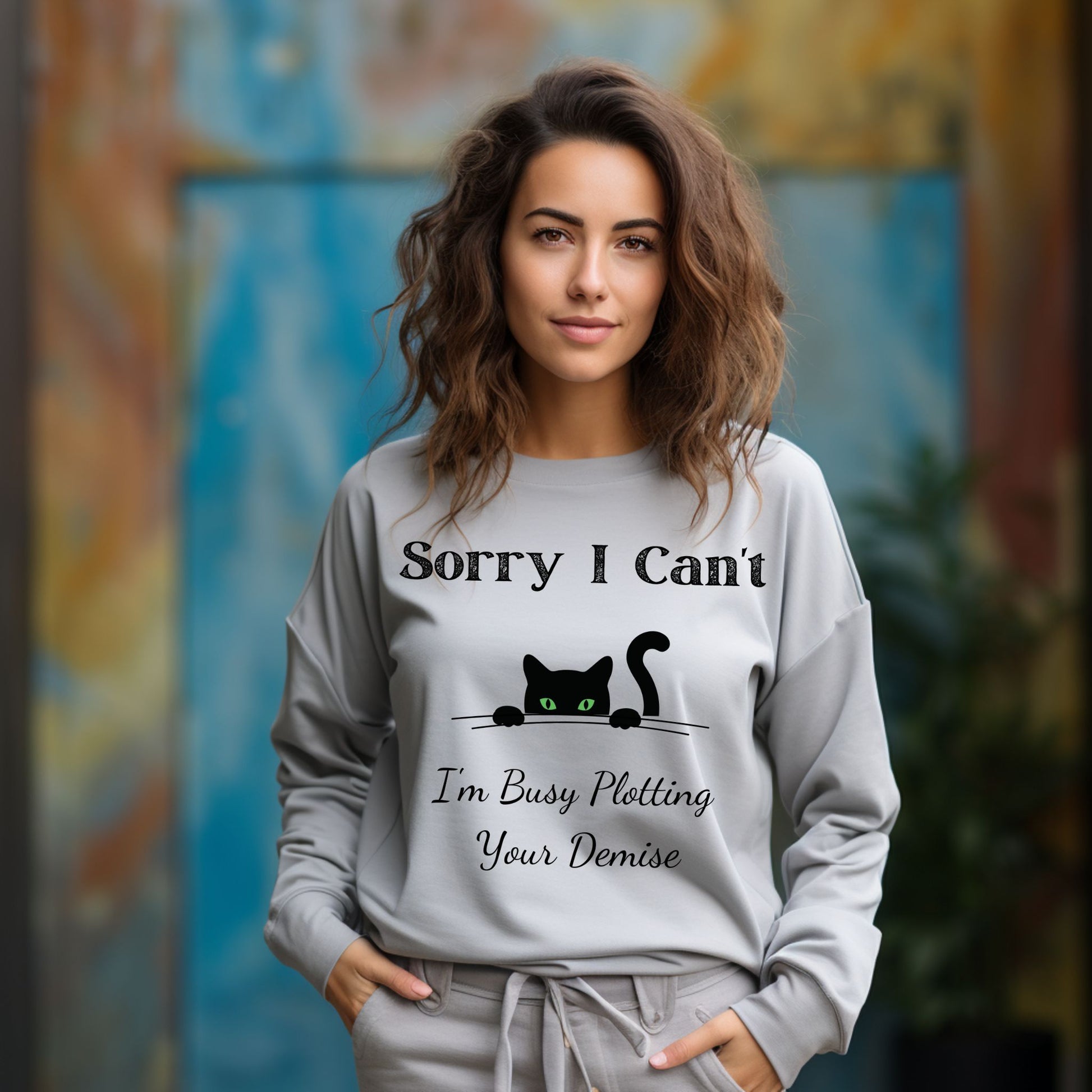 A comfortable and durable unisex t-shirt featuring a graphic of a black cat peeking over a counter with text that reads 'Sorry I Can't I'm Plotting Your Demise'. This tee exudes a fun and slightly mischievous vibe, perfect for cat lovers or those with a sense of humor. Ideal for casual wear or as a conversation starter during Halloween or spooky-themed events.