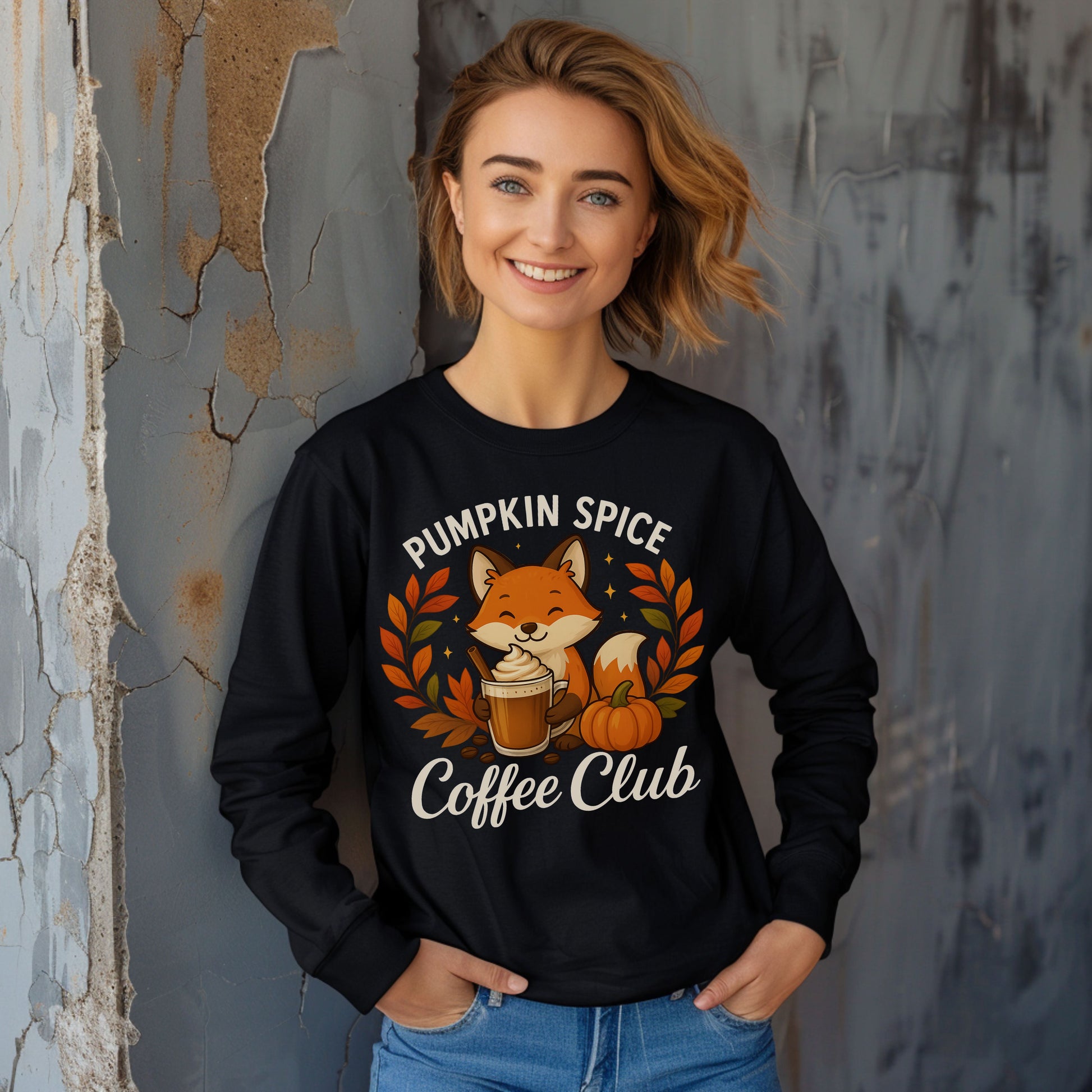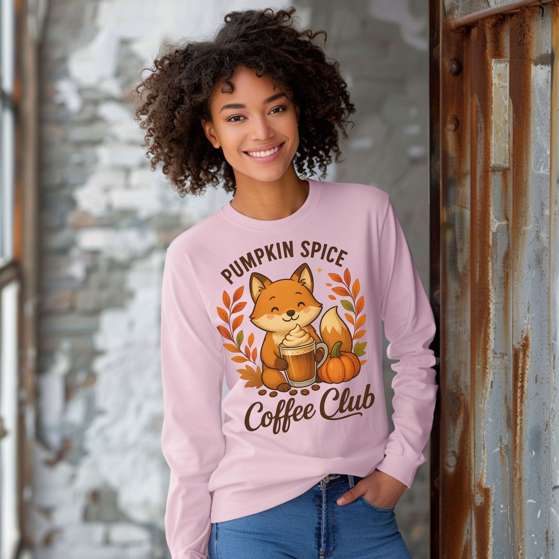 Pumpkin Spice Coffee Club Long Sleeve Tee | Cozy Autumn Apparel, Fall Shirt, Fox Graphic Tee, Unisex Fashion, Gift for Coffee Lovers