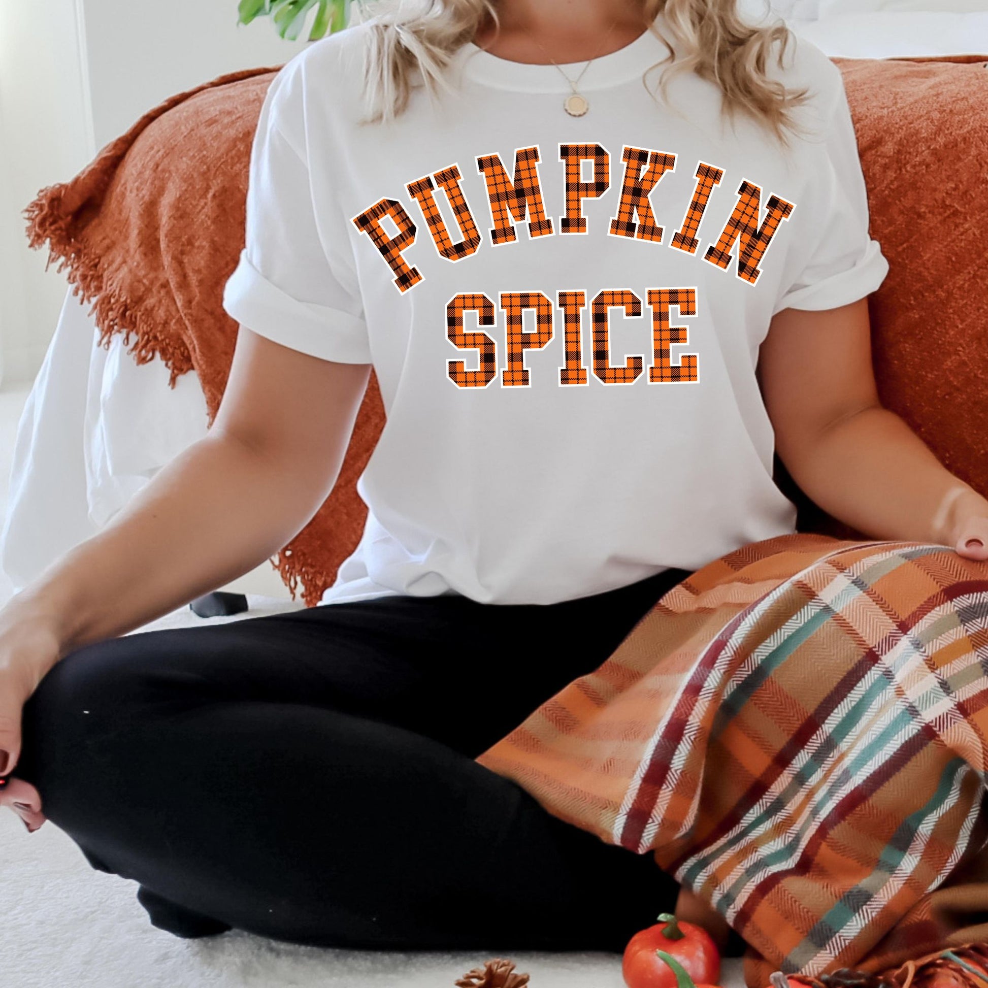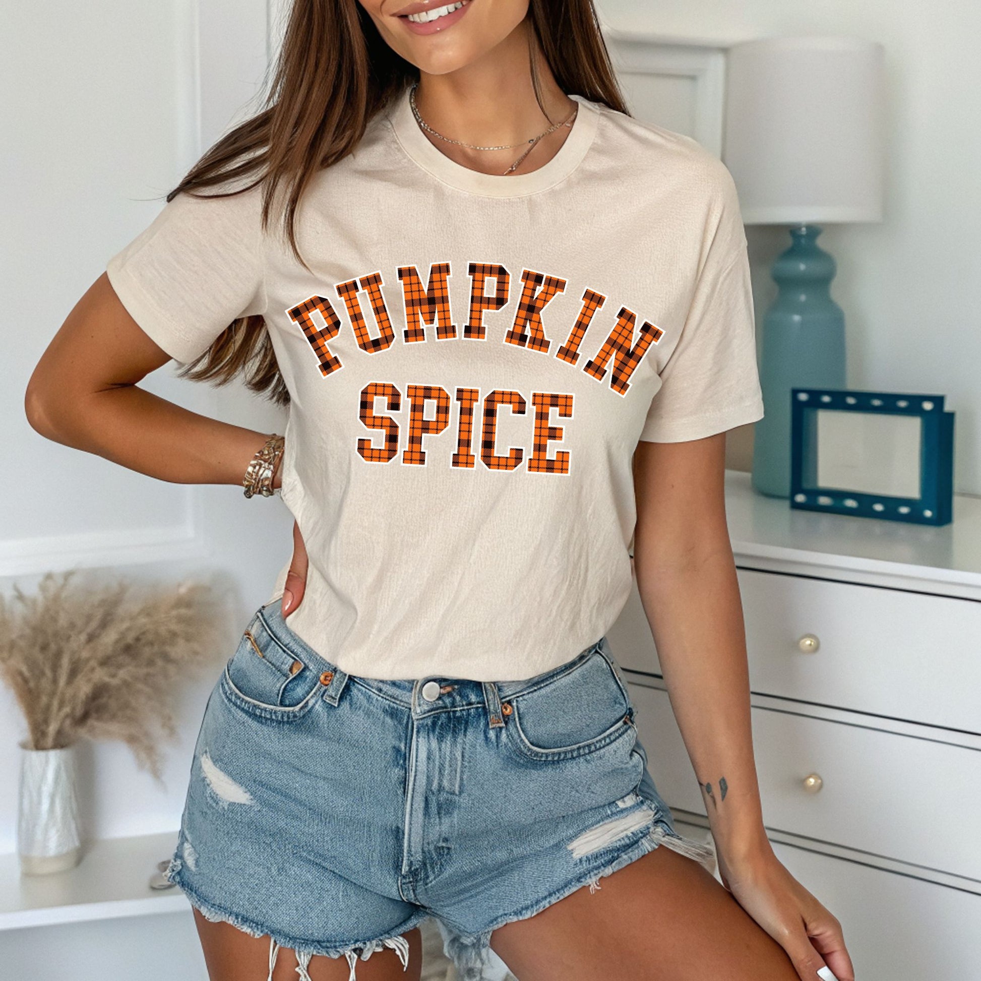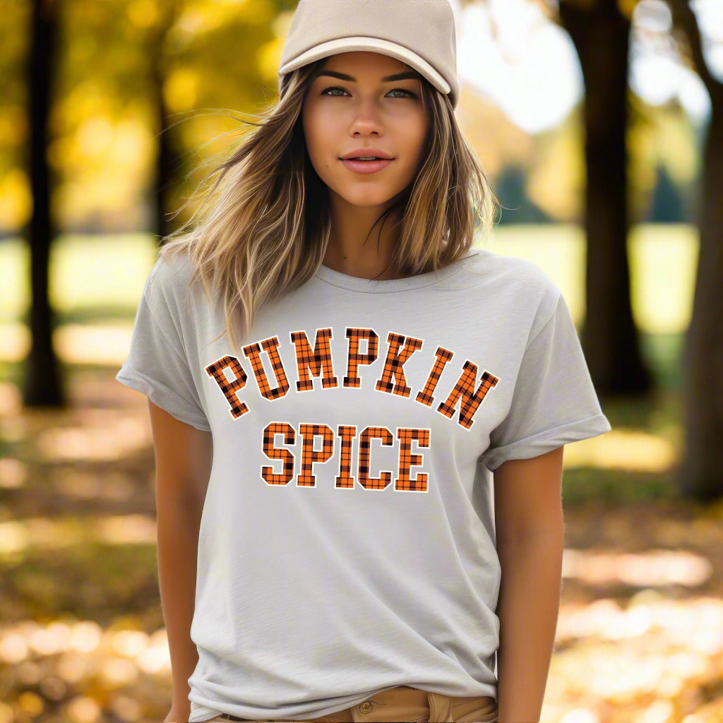 Show off your love for fall flavors with our Pumpkin Spice T-Shirt! Featuring bold varsity-style lettering filled with a classic orange and black plaid flannel pattern, this autumn-themed tee is perfect for cozy days, pumpkin patch visits, and sipping on your favorite seasonal latte. With a simple yet stylish design, it’s a must-have for anyone who loves pumpkin spice season and fall fashion. Perfect for layering with sweaters, jackets, or worn solo for a casual autumn vibe!
