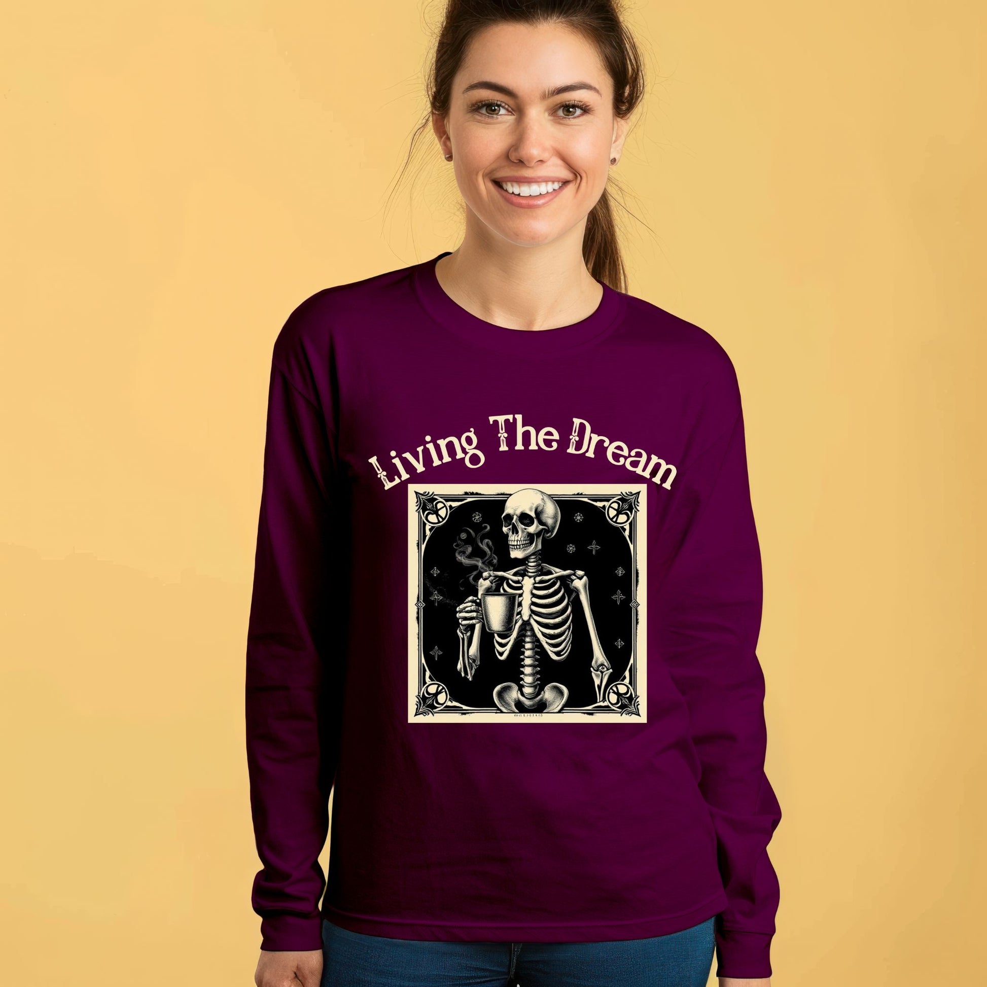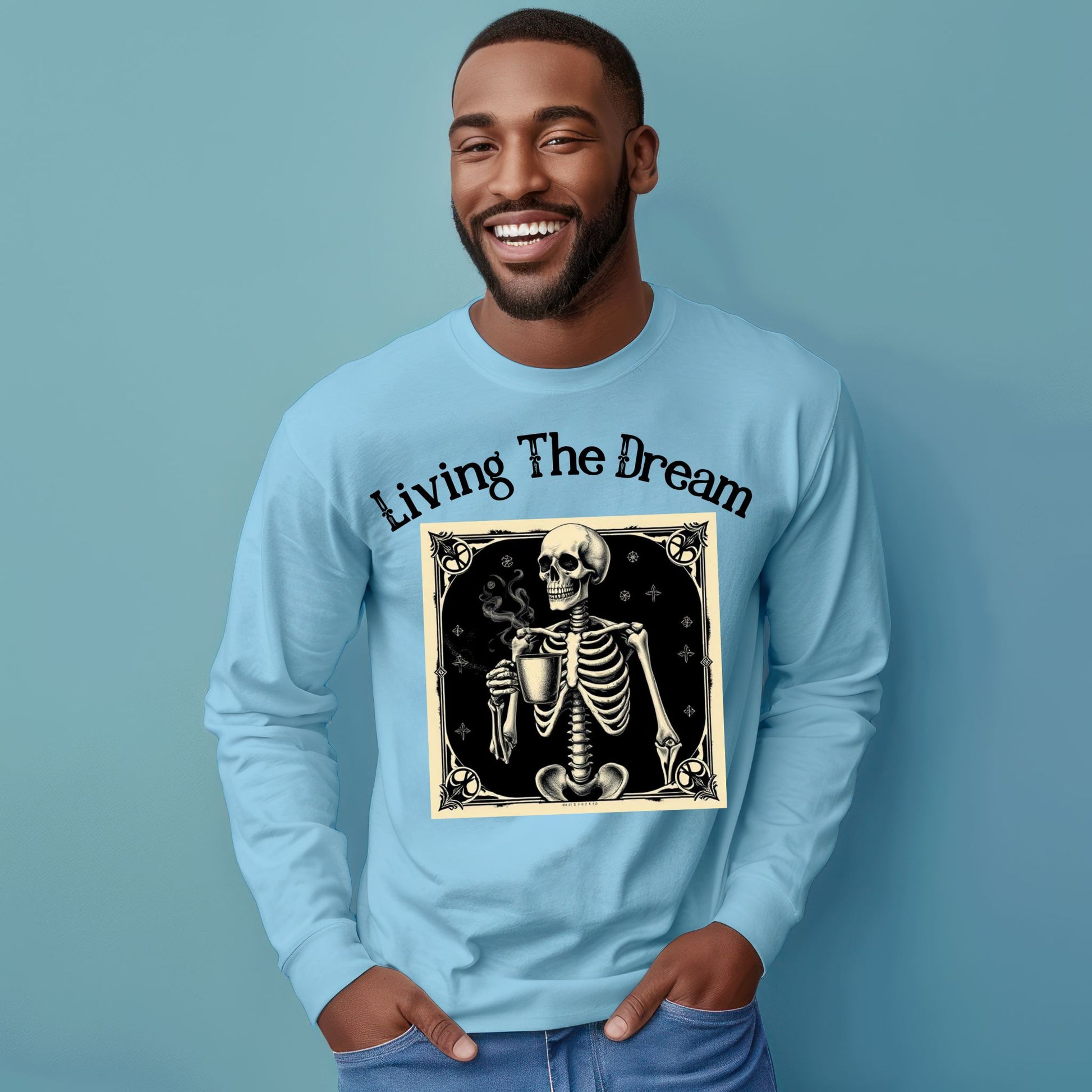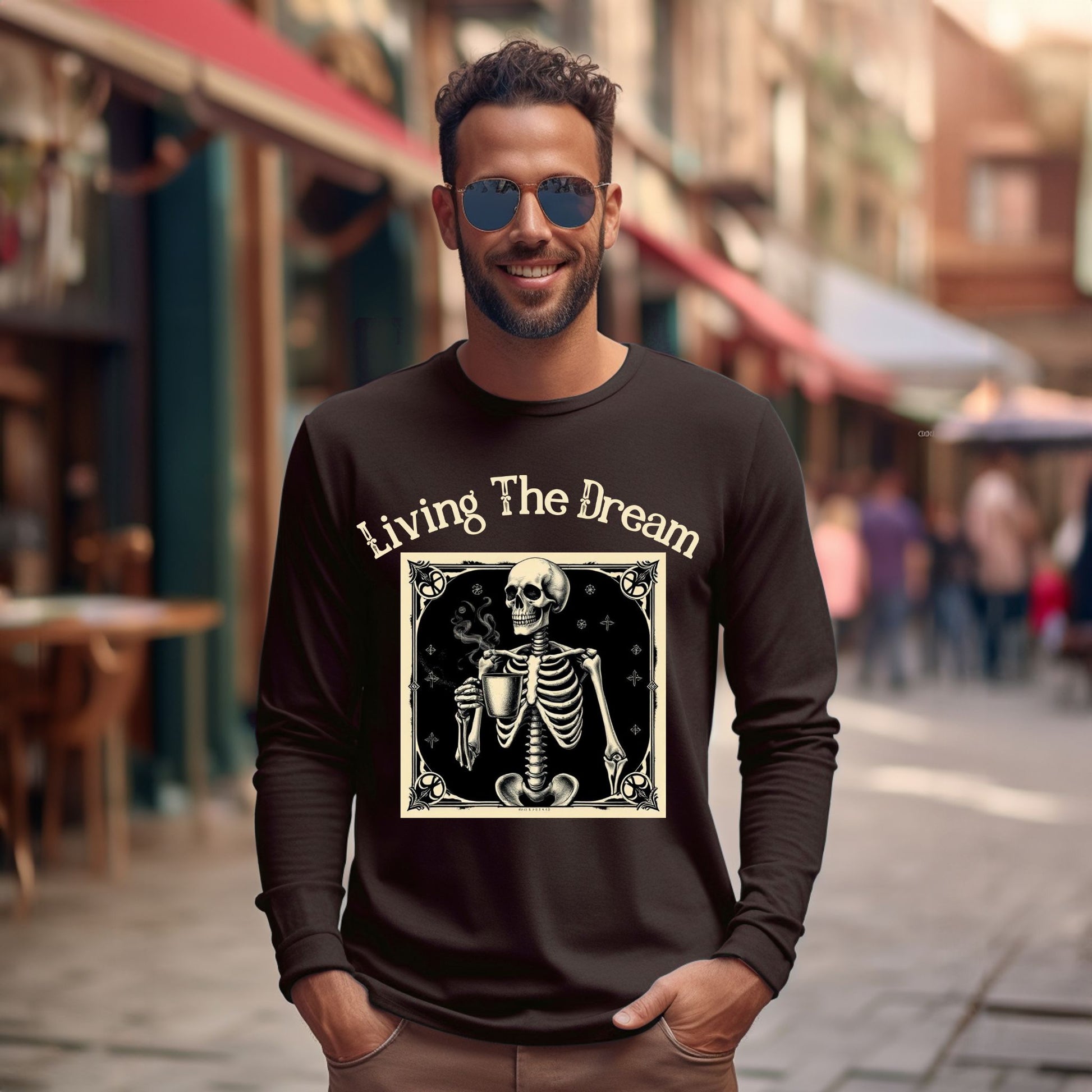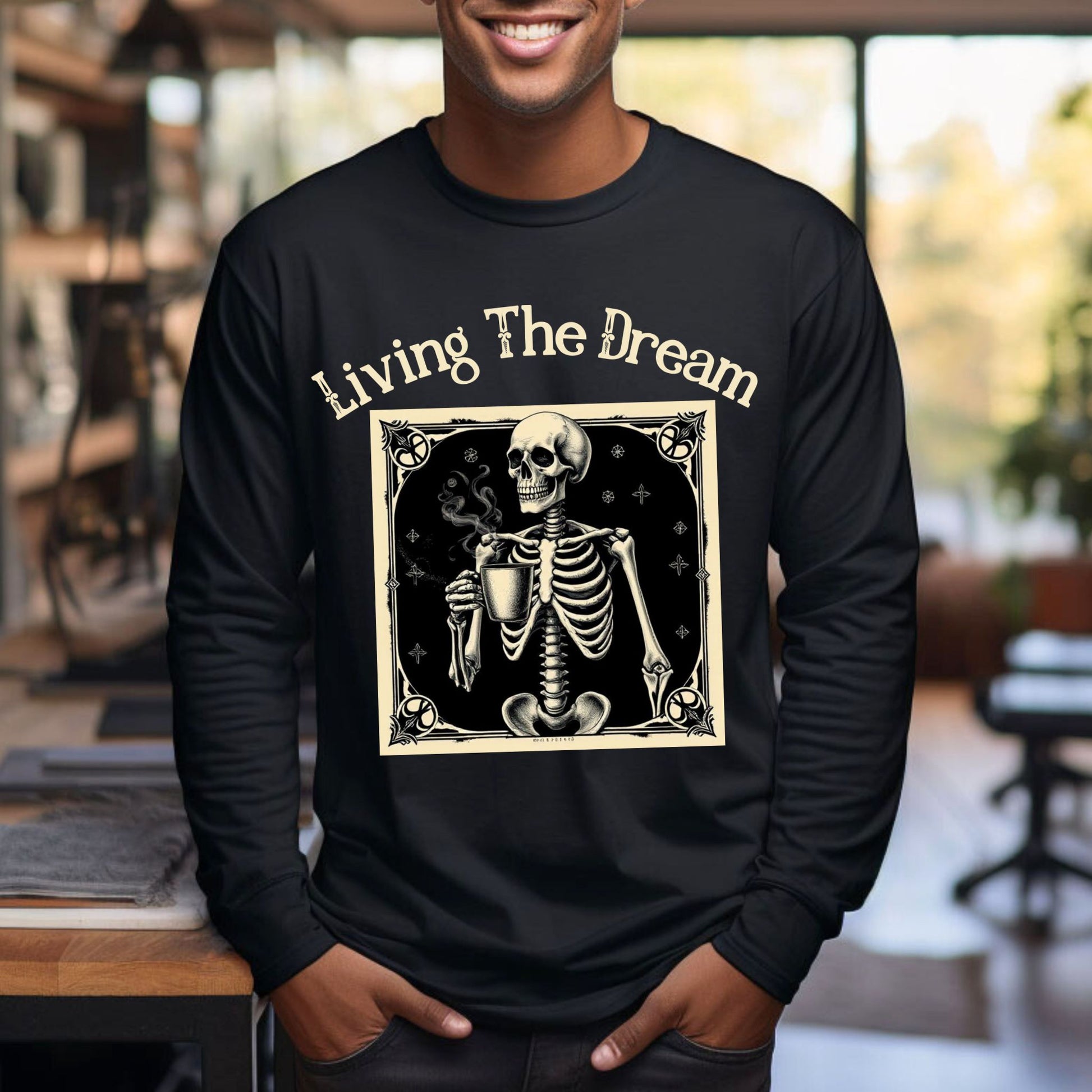 Skeleton Coffee Lover T-Shirt Vintage Goth Style, “Living The Dream” Long Sleeve Tee