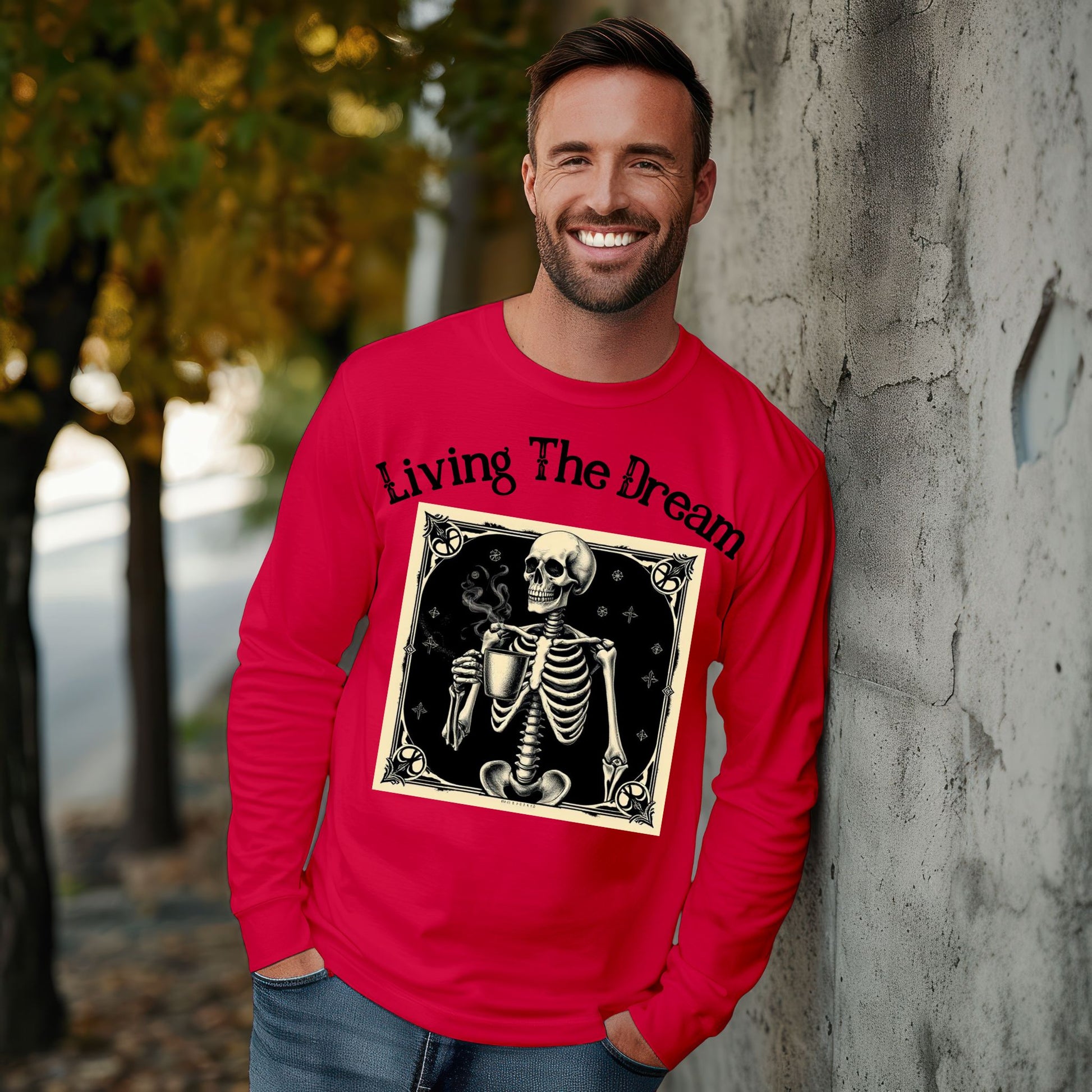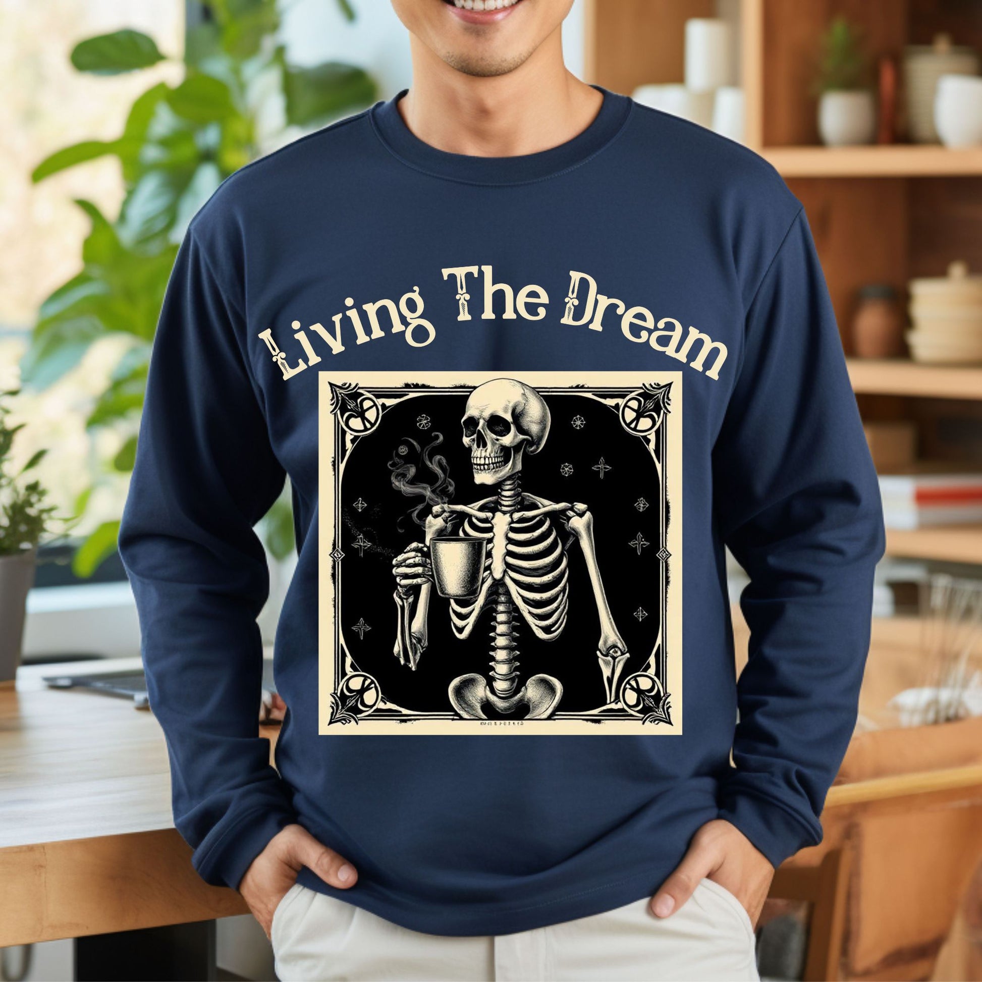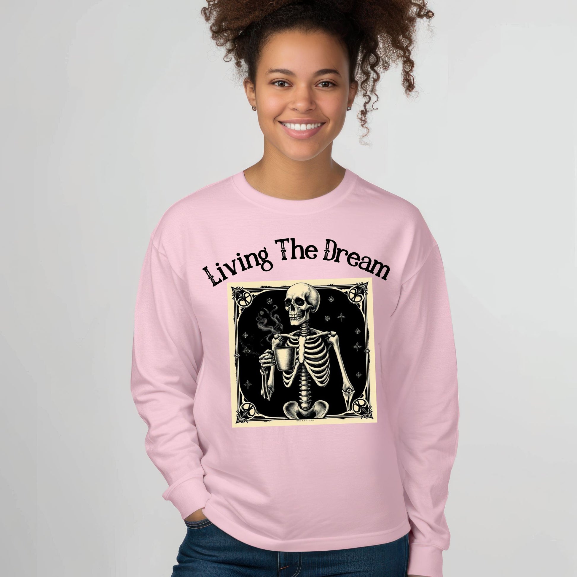 Skeleton Coffee Lover T-Shirt Vintage Goth Style, “Living The Dream” Long Sleeve Tee
