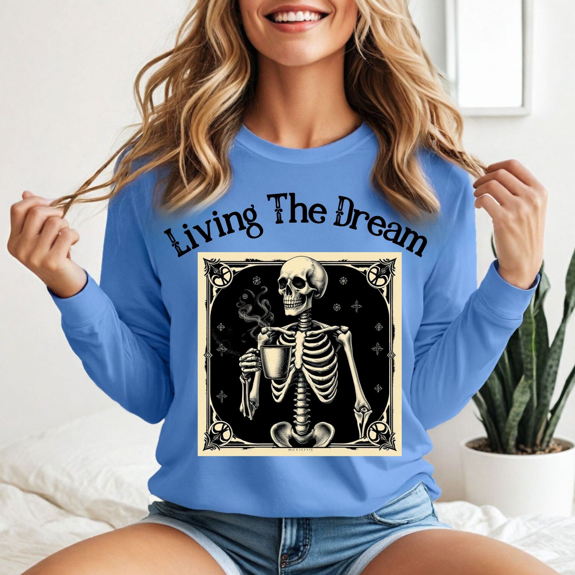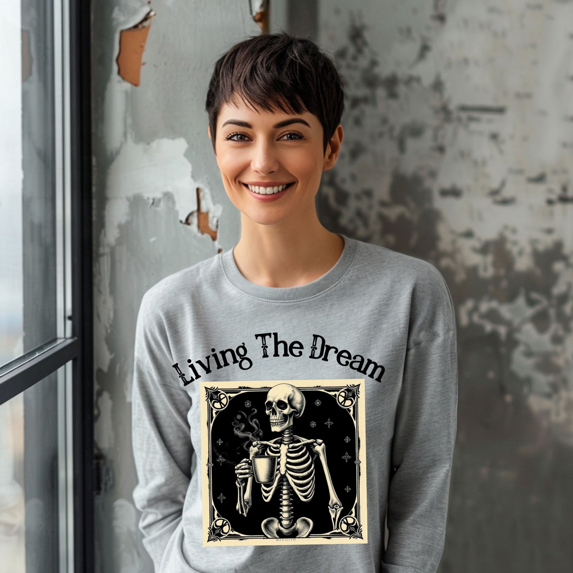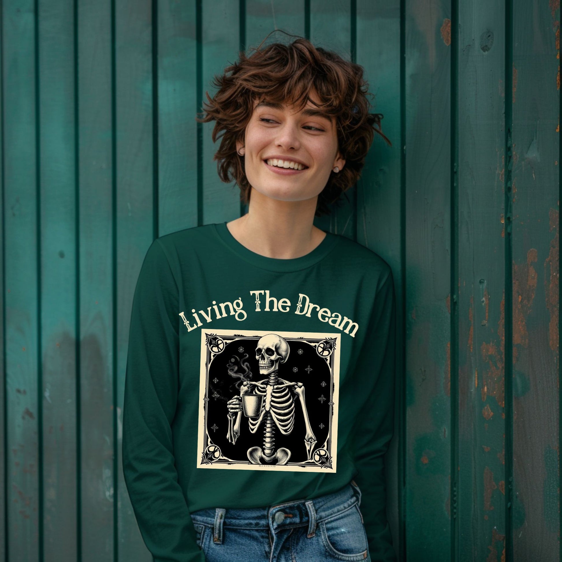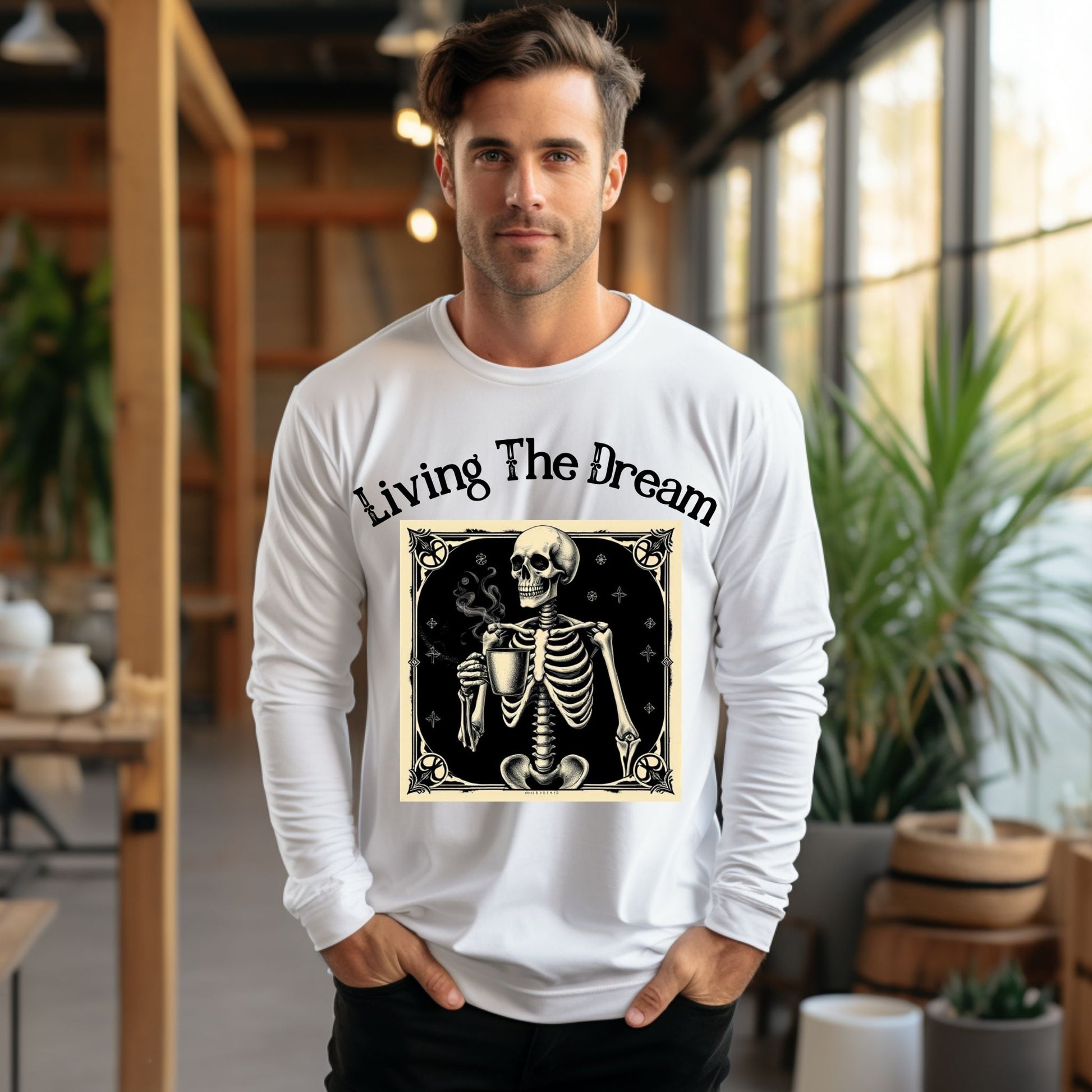 Skeleton Coffee Lover T-Shirt Vintage Goth Style, “Living The Dream” Long Sleeve Tee