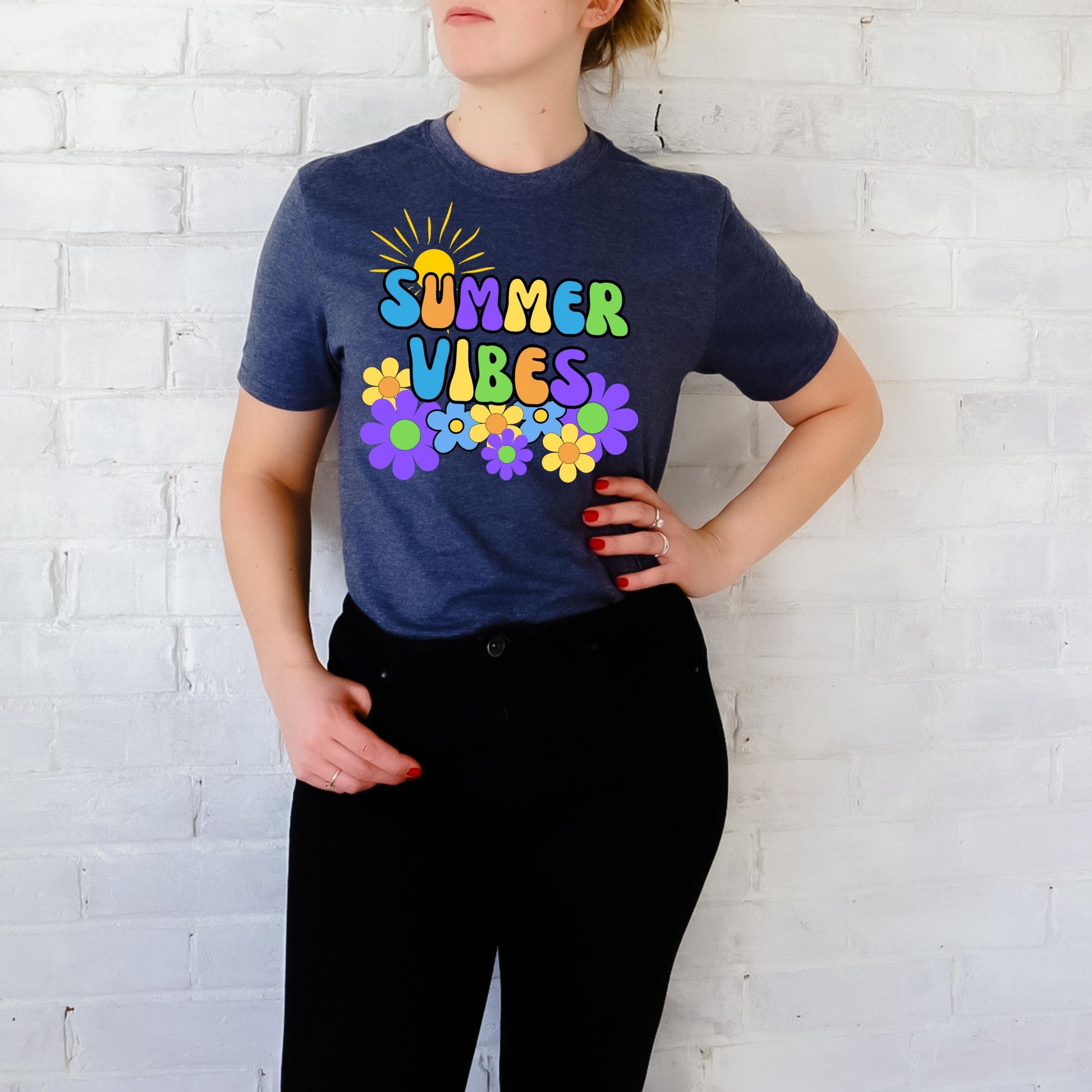 Summer Vibes T-Shirt – Retro Sun & Flower Graphic Tee with Vintage Font