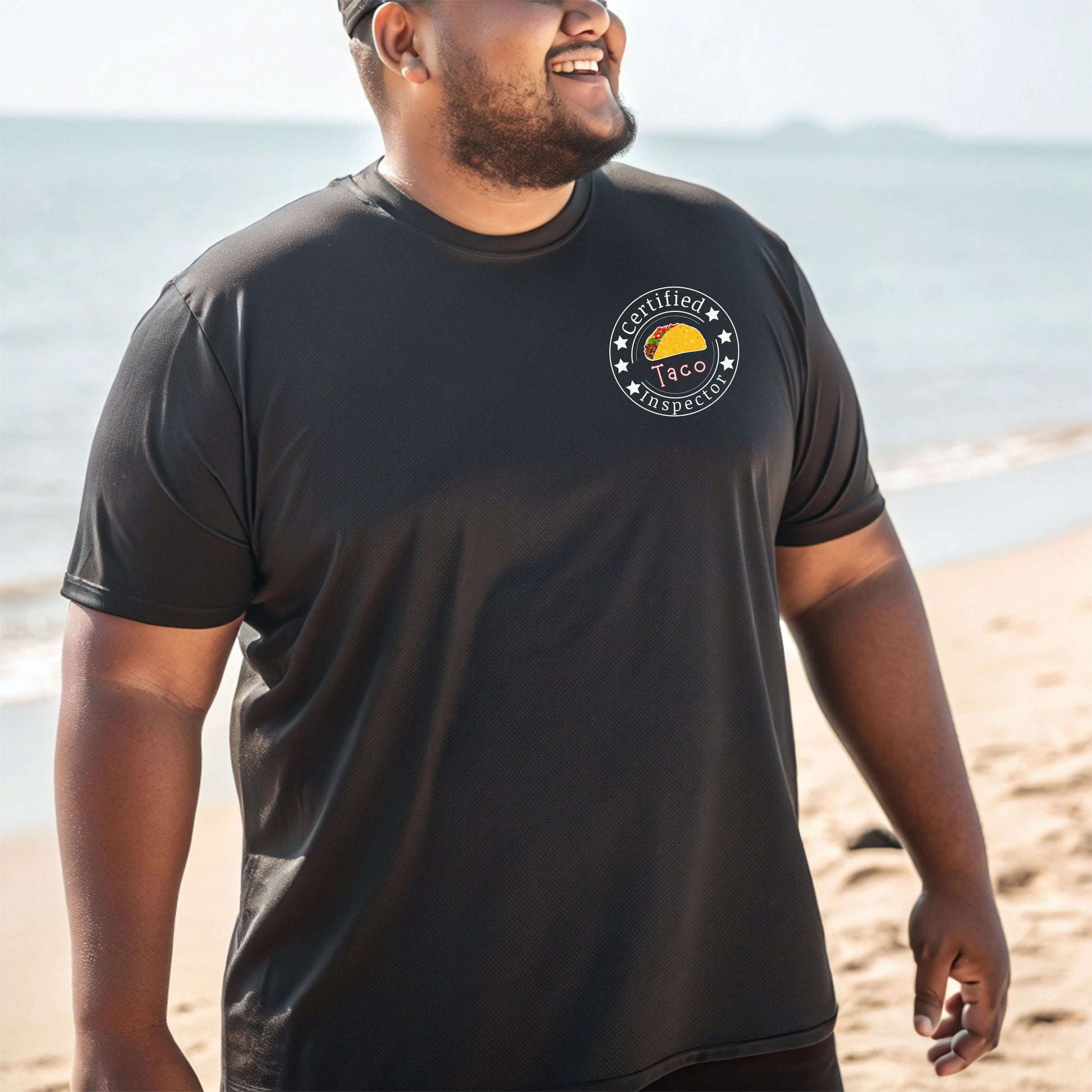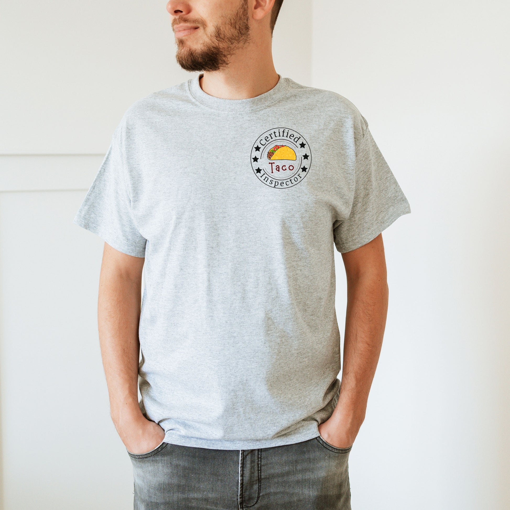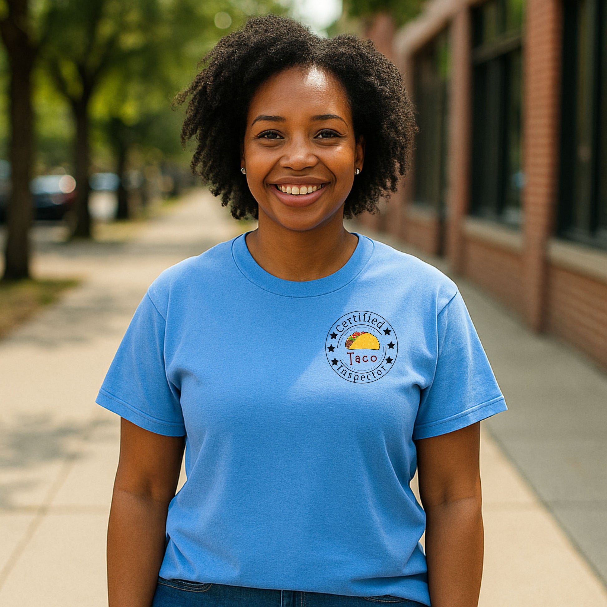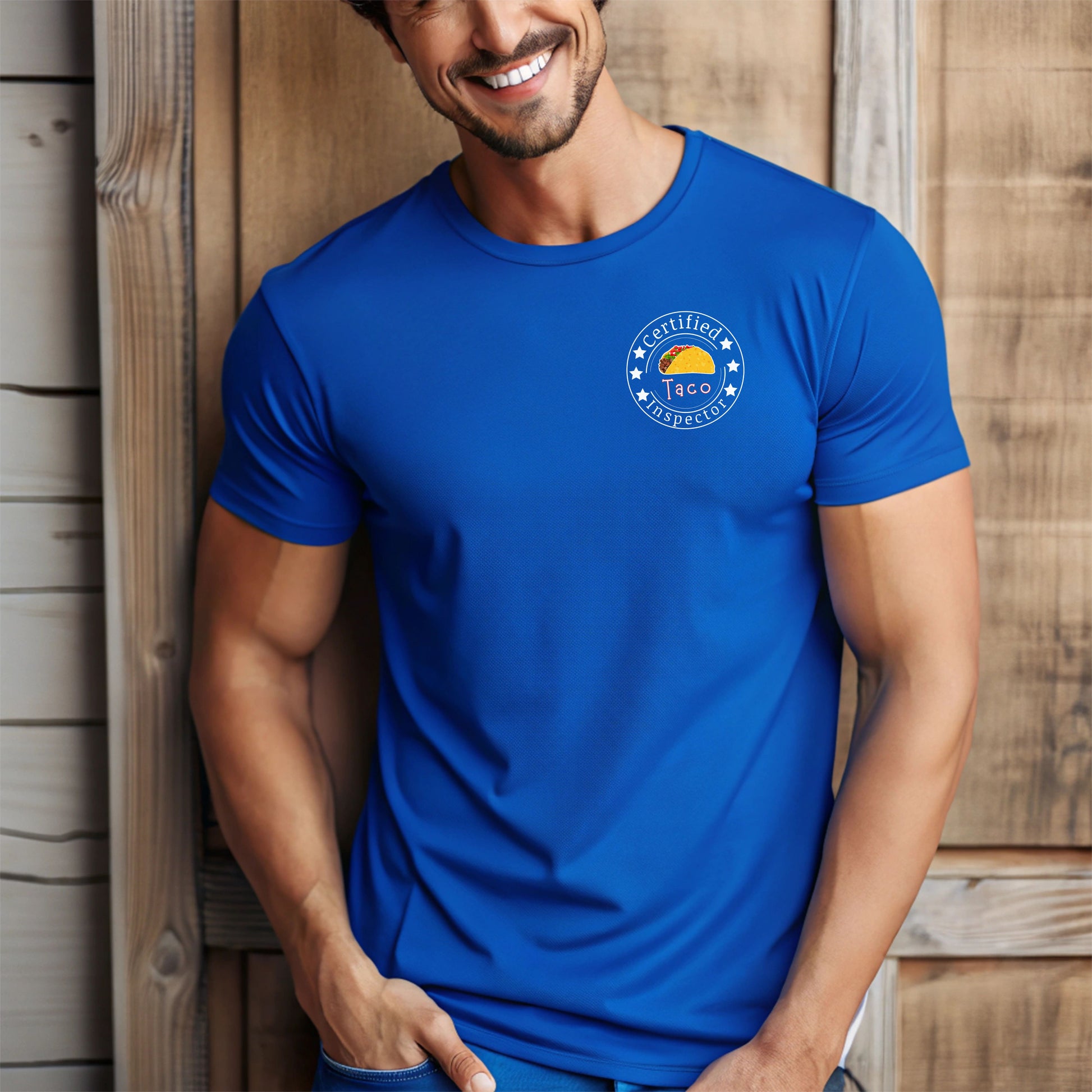Printed on a high-quality, soft cotton shirt, it also includes a playful “Certified Taco Inspector” emblem on the front pocket area — because tacos deserve to be taken seriously. 😉