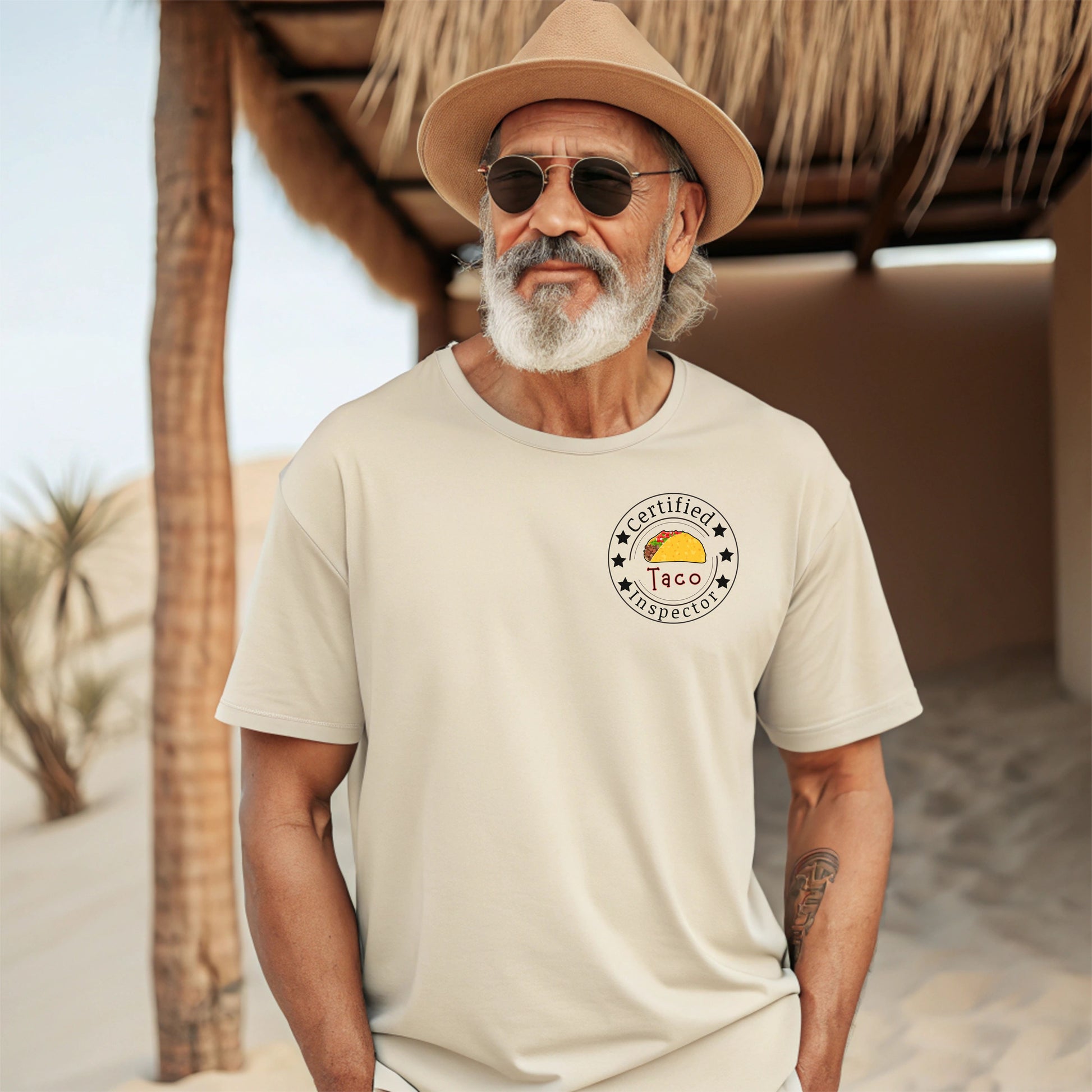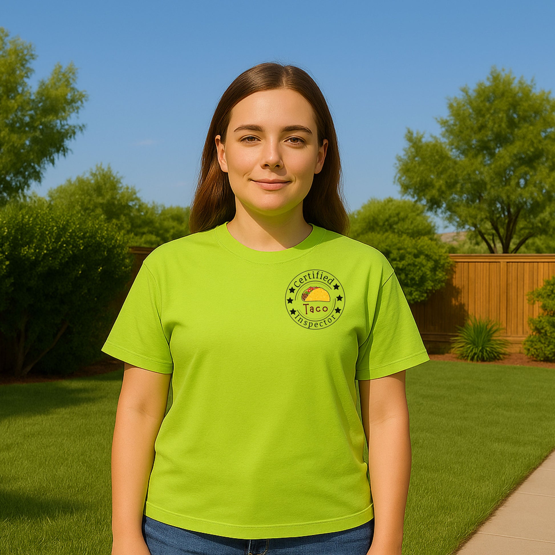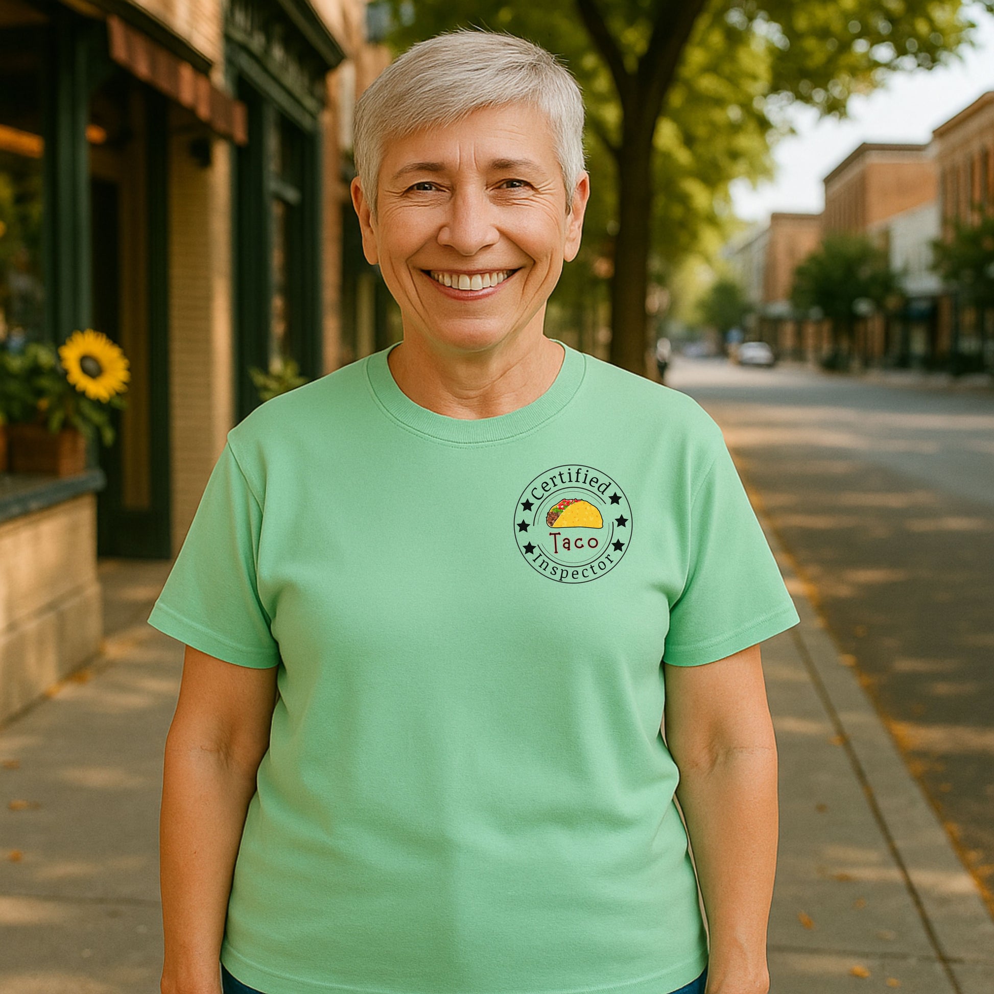 Printed on a high-quality, soft cotton shirt, it also includes a playful “Certified Taco Inspector” emblem on the front pocket area — because tacos deserve to be taken seriously. 😉