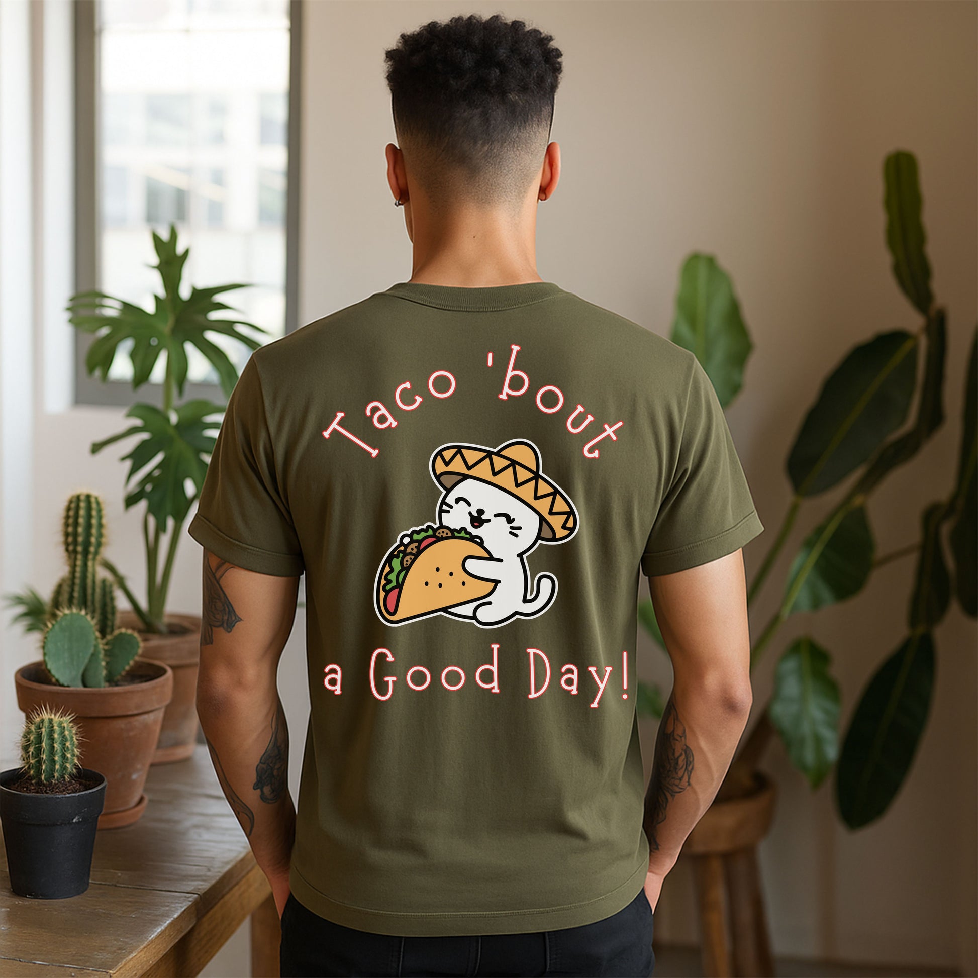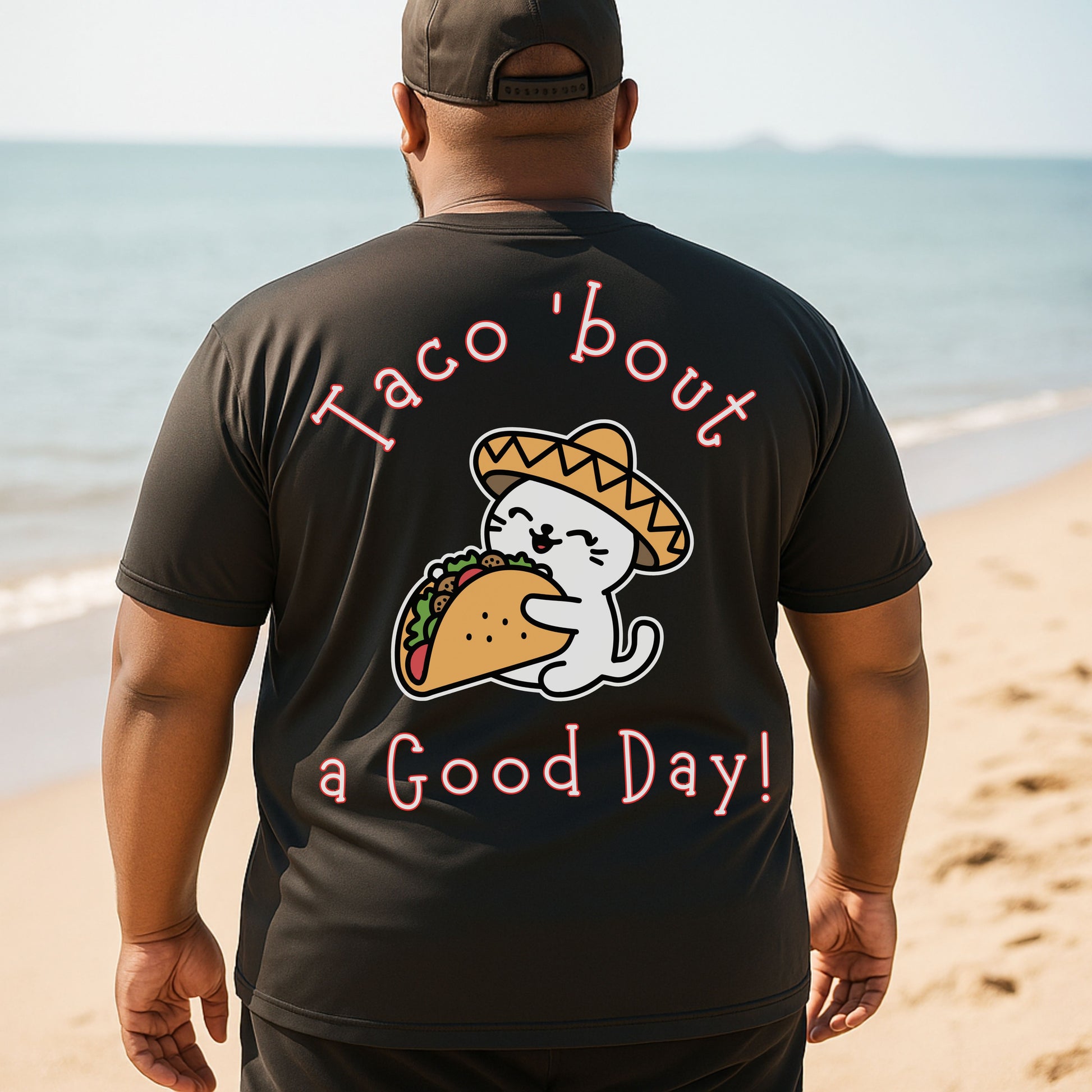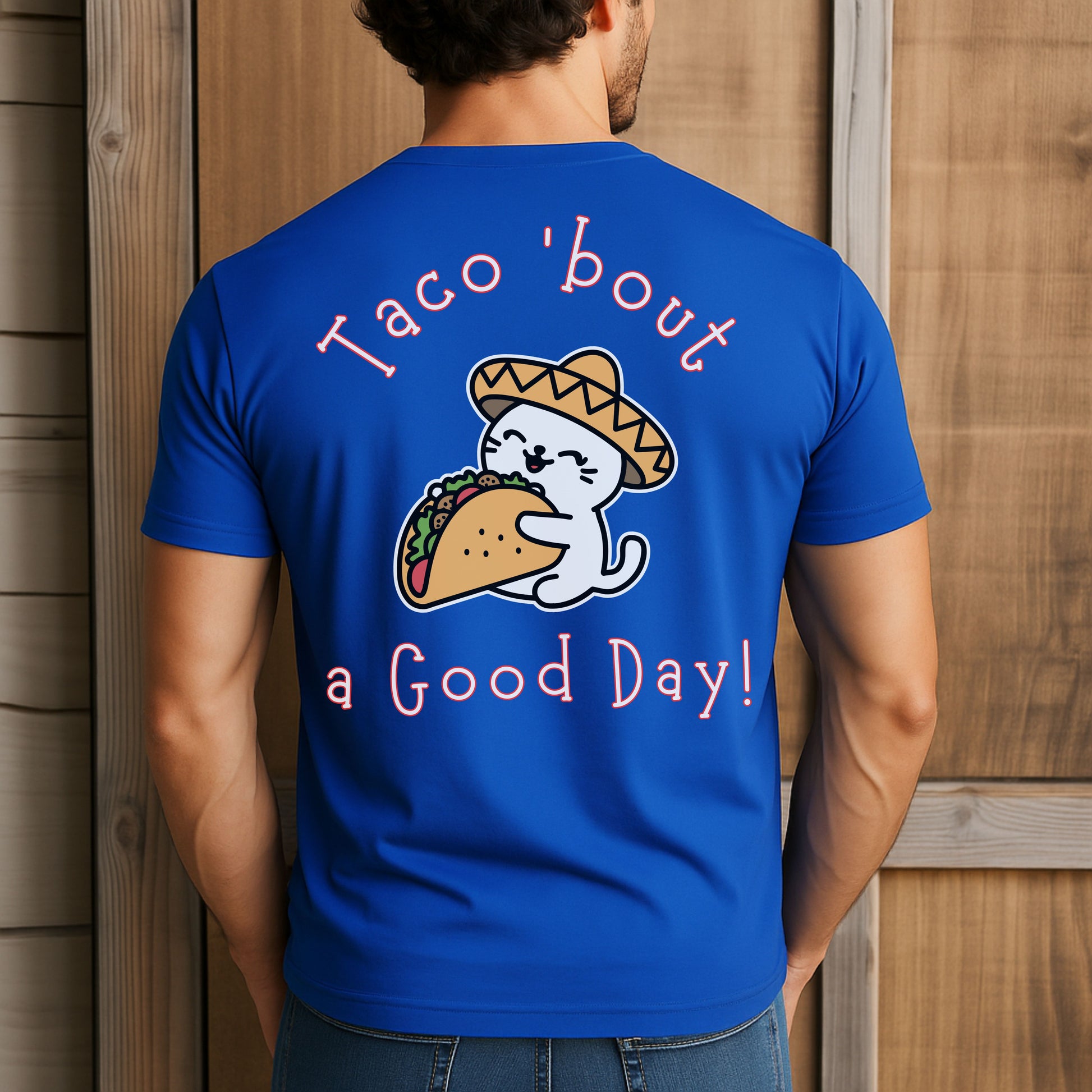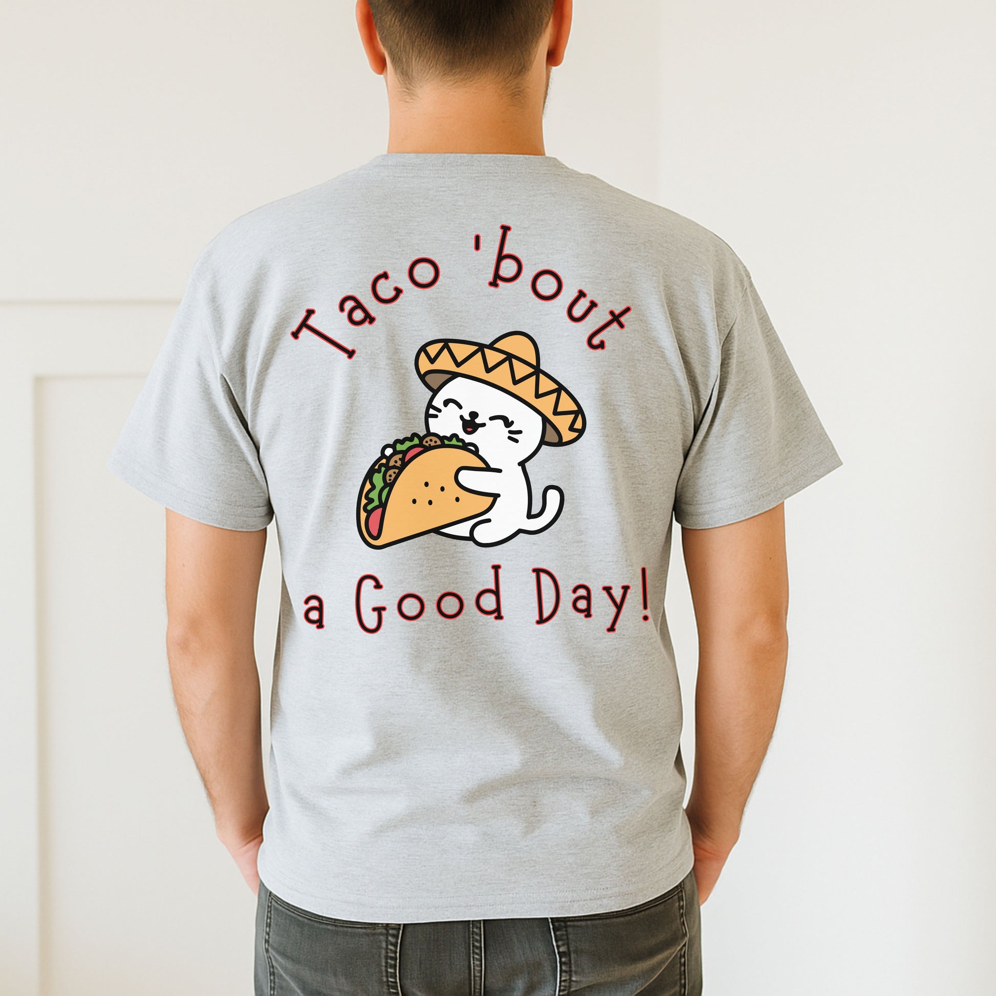 Spice up your wardrobe with this hilarious and adorable Taco 'Bout a Good Day cat t-shirt! Featuring a cute cartoon cat in a sombrero hugging a taco, this graphic tee is perfect for taco lovers, cat enthusiasts, and anyone who appreciates a good pun. Whether it's Taco Tuesday, Cinco de Mayo, or just a day you need to smile, this comfy tee delivers the laughs and the flavor.