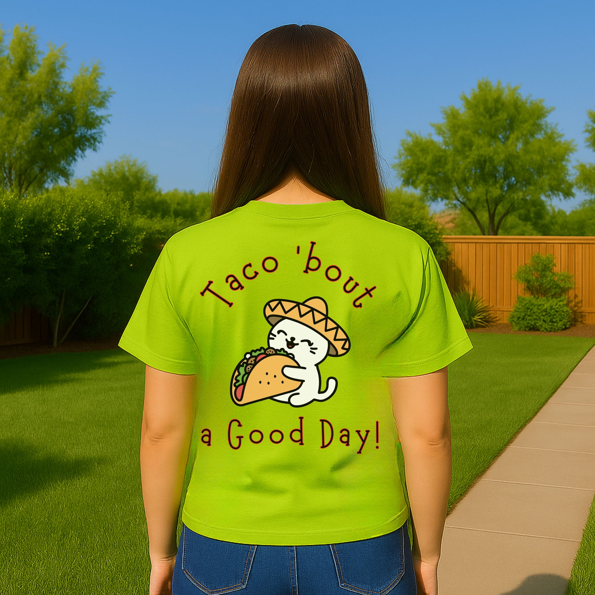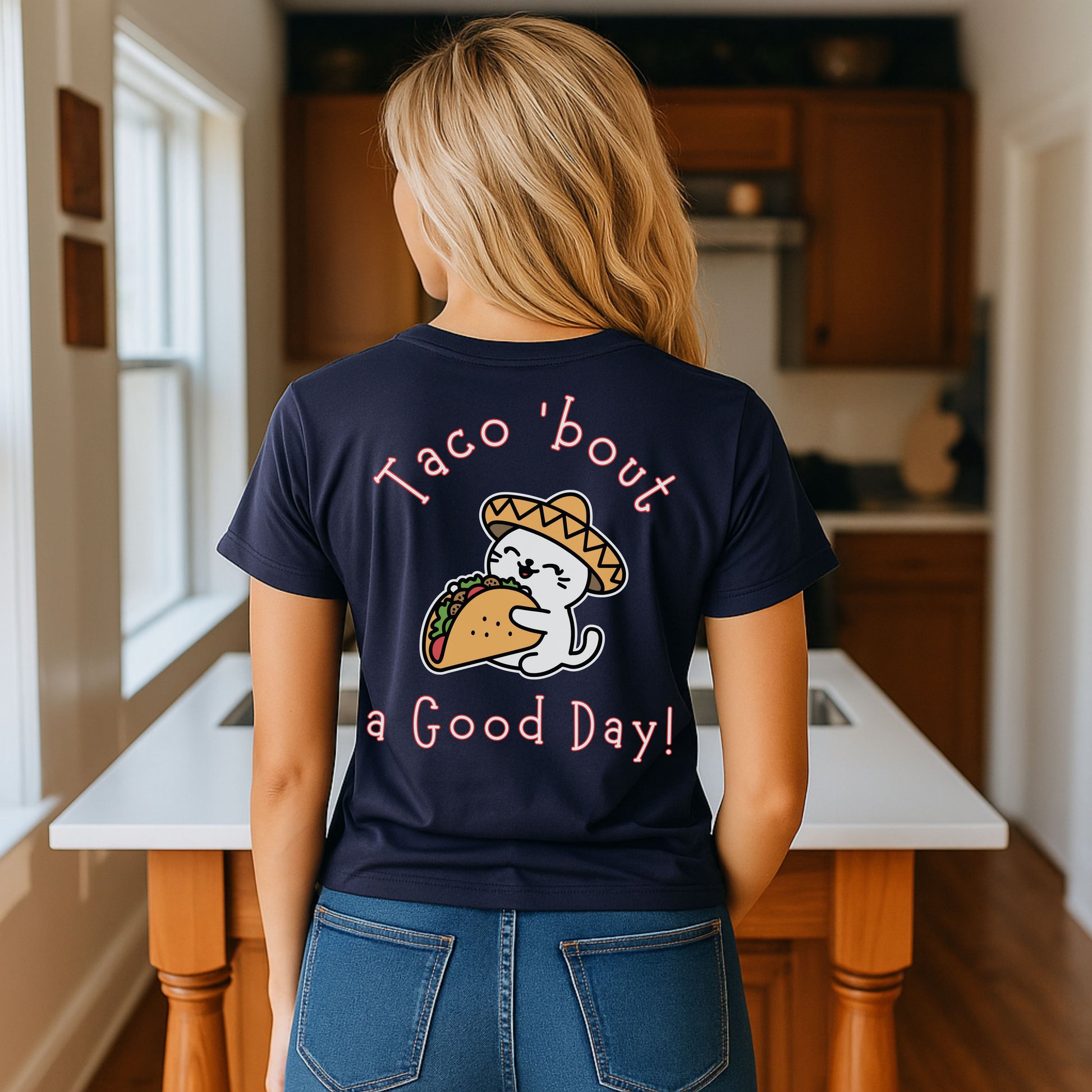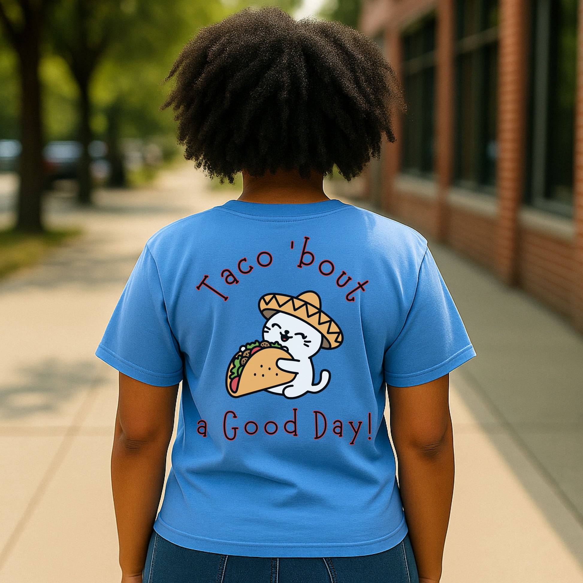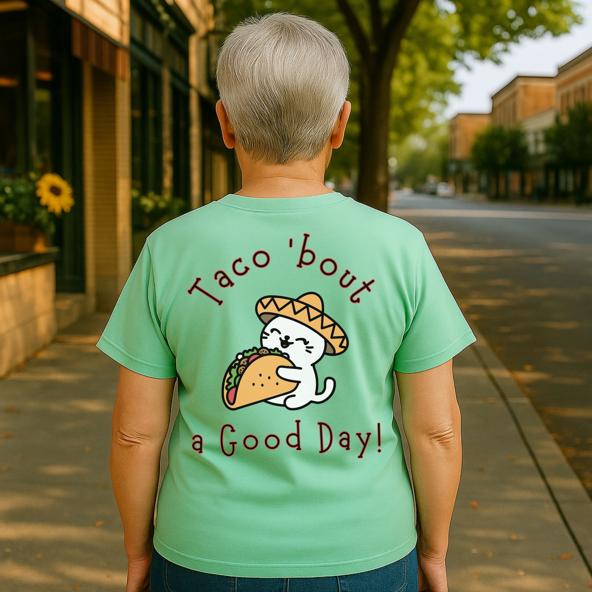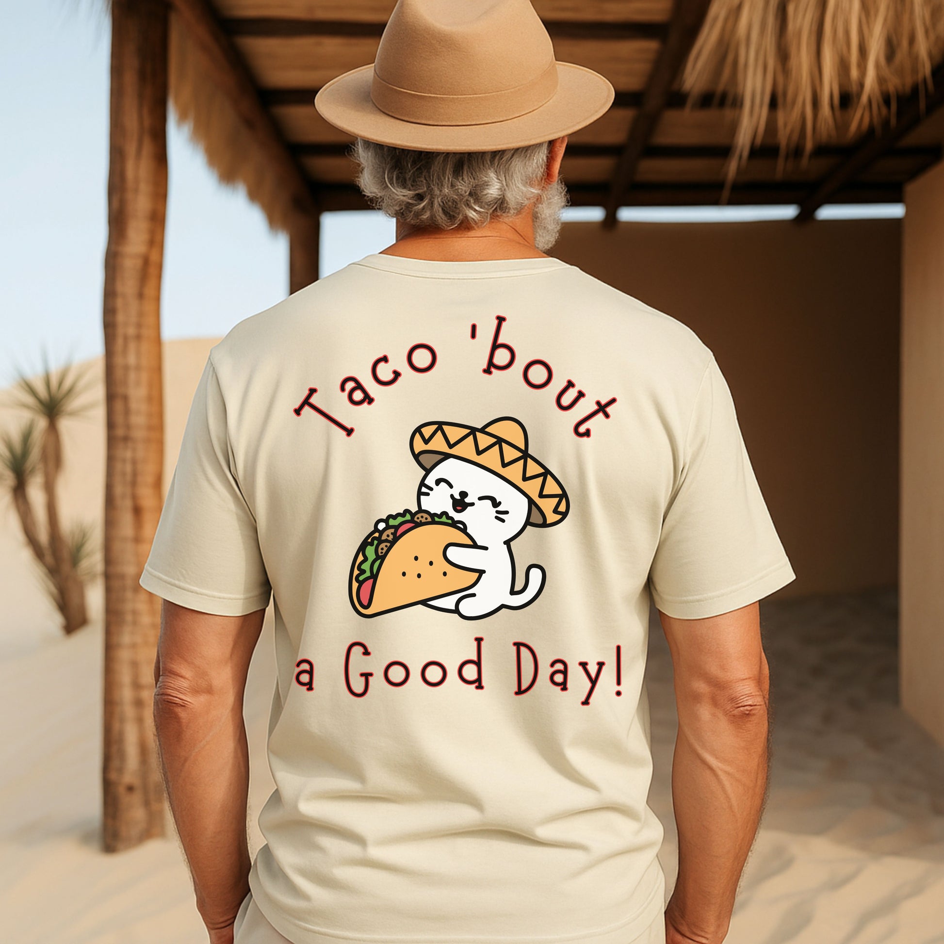 Spice up your wardrobe with this hilarious and adorable Taco 'Bout a Good Day cat t-shirt! Featuring a cute cartoon cat in a sombrero hugging a taco, this graphic tee is perfect for taco lovers, cat enthusiasts, and anyone who appreciates a good pun. Whether it's Taco Tuesday, Cinco de Mayo, or just a day you need to smile, this comfy tee delivers the laughs and the flavor.