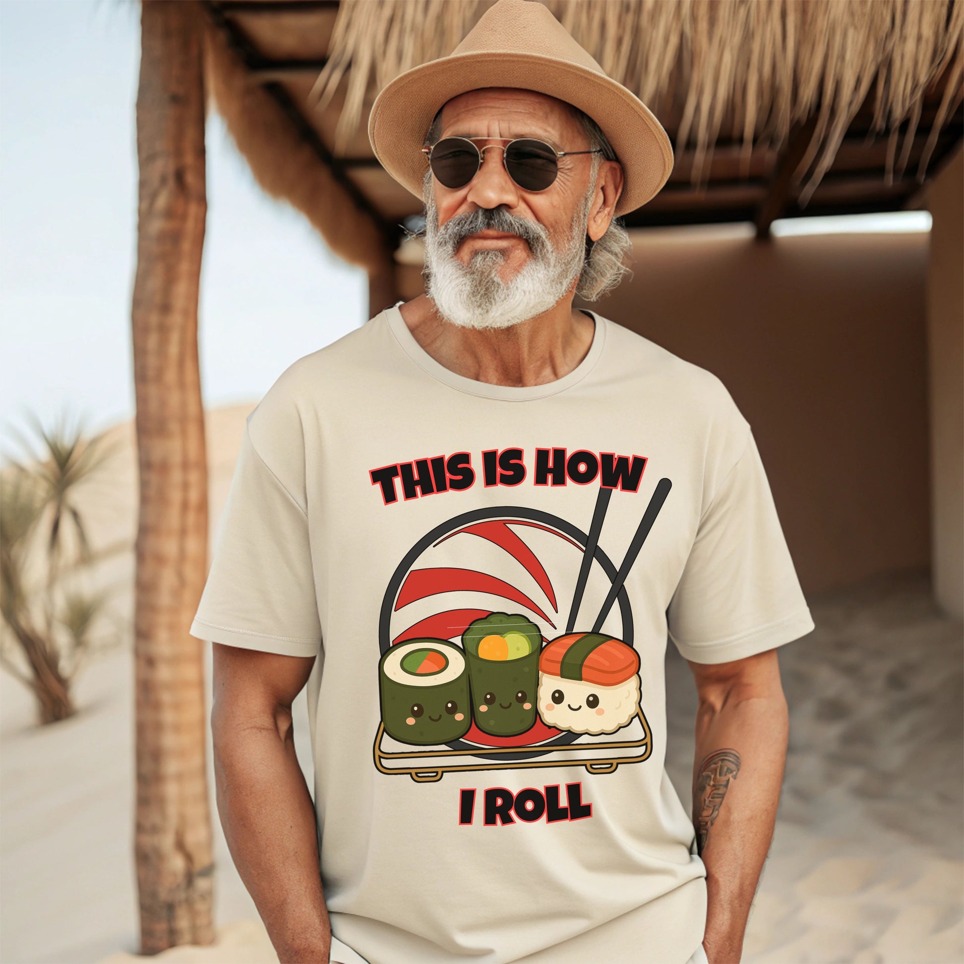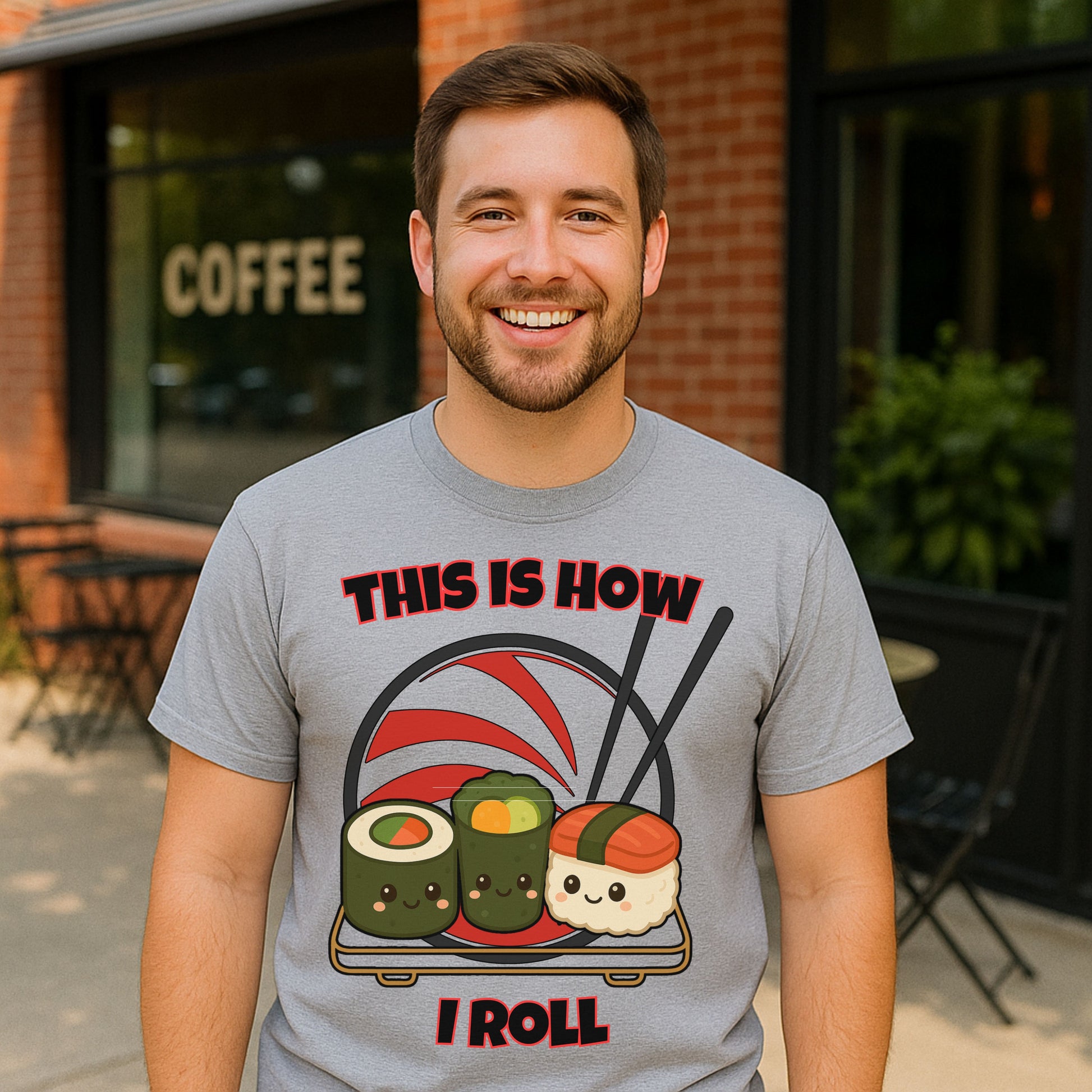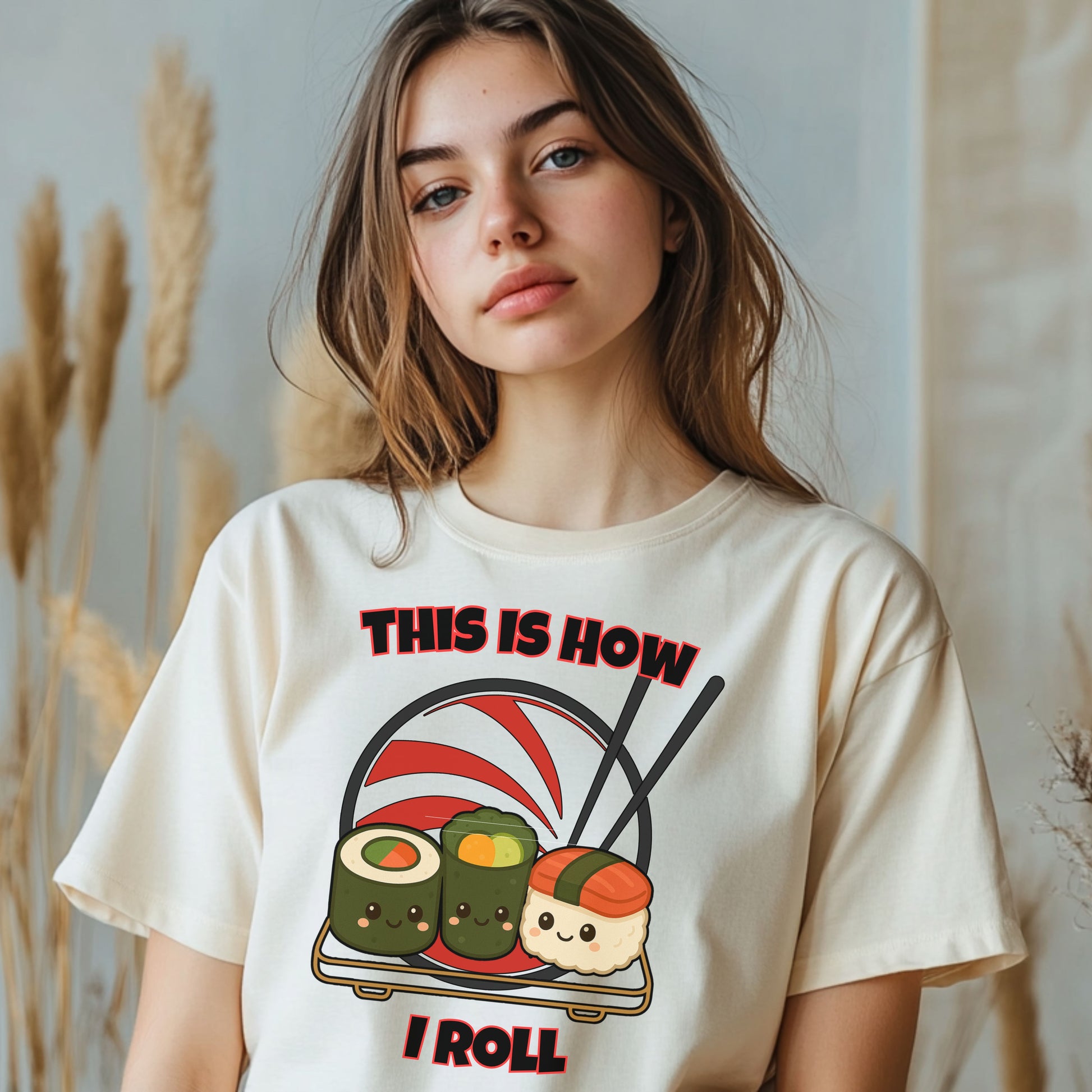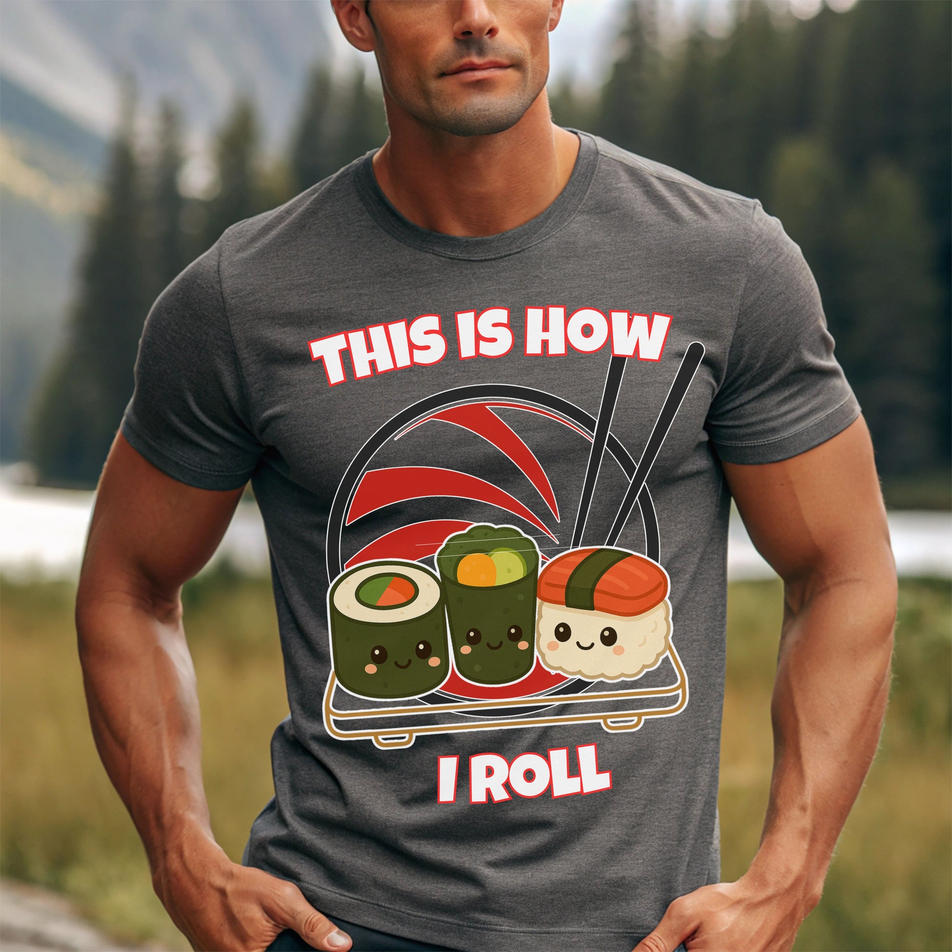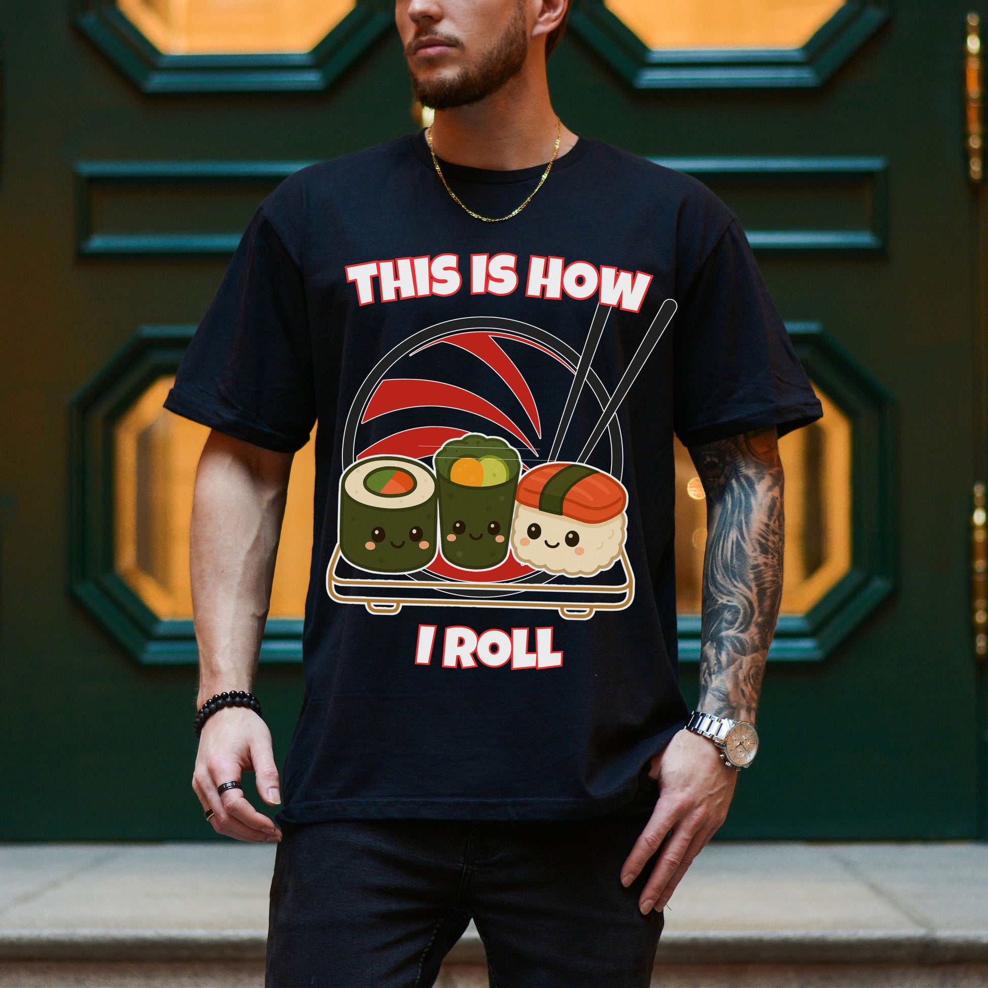 Roll into style with this playful "This Is How I Roll" sushi t-shirt, featuring adorable kawaii sushi characters and bold Japanese-inspired design. Whether you're a foodie, sushi lover, or just love punny tees, this graphic shirt is perfect for casual outings, anime conventions, or matching with your sushi squad.