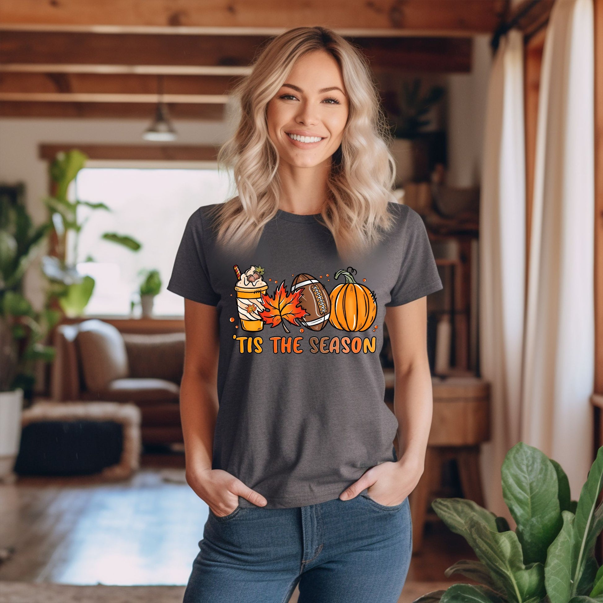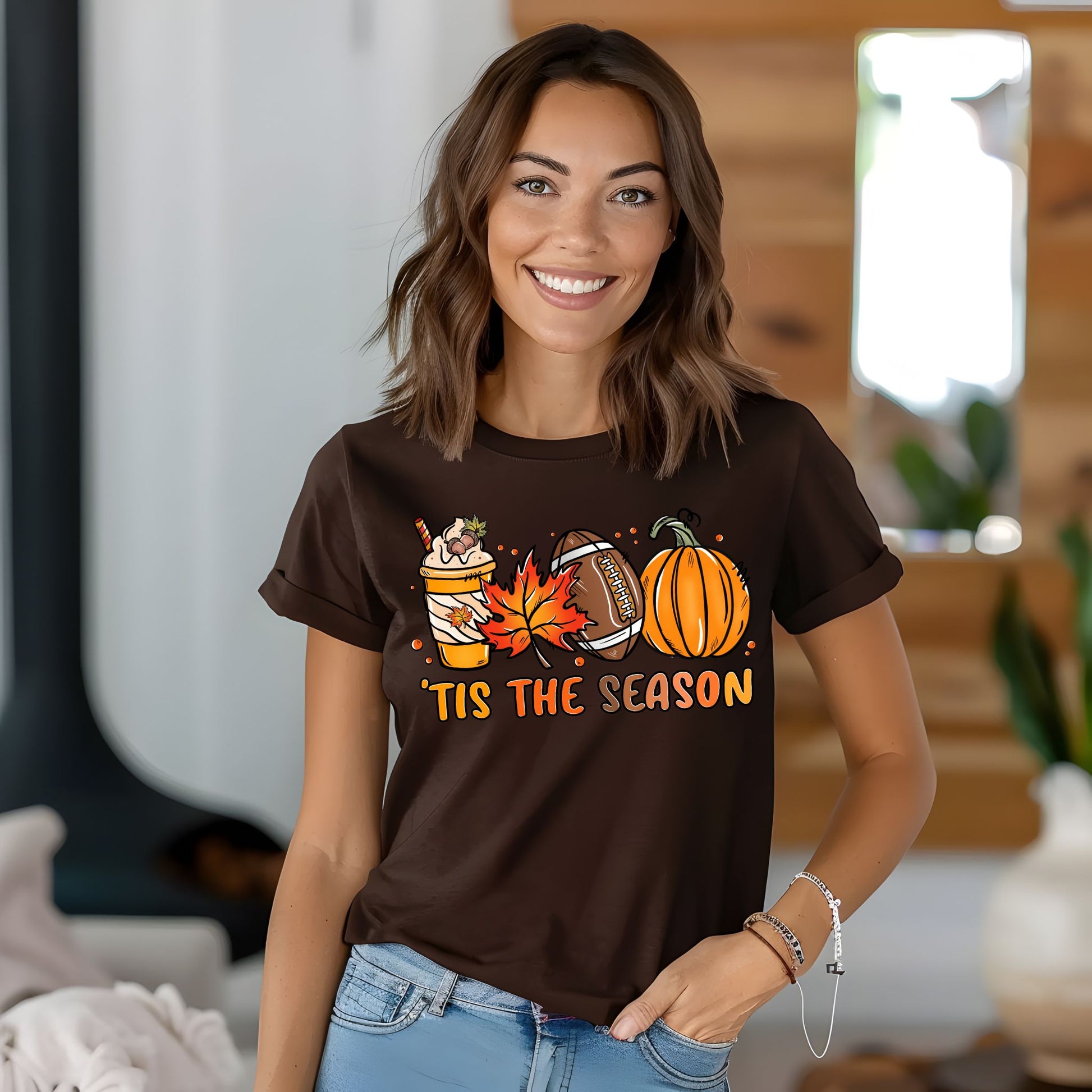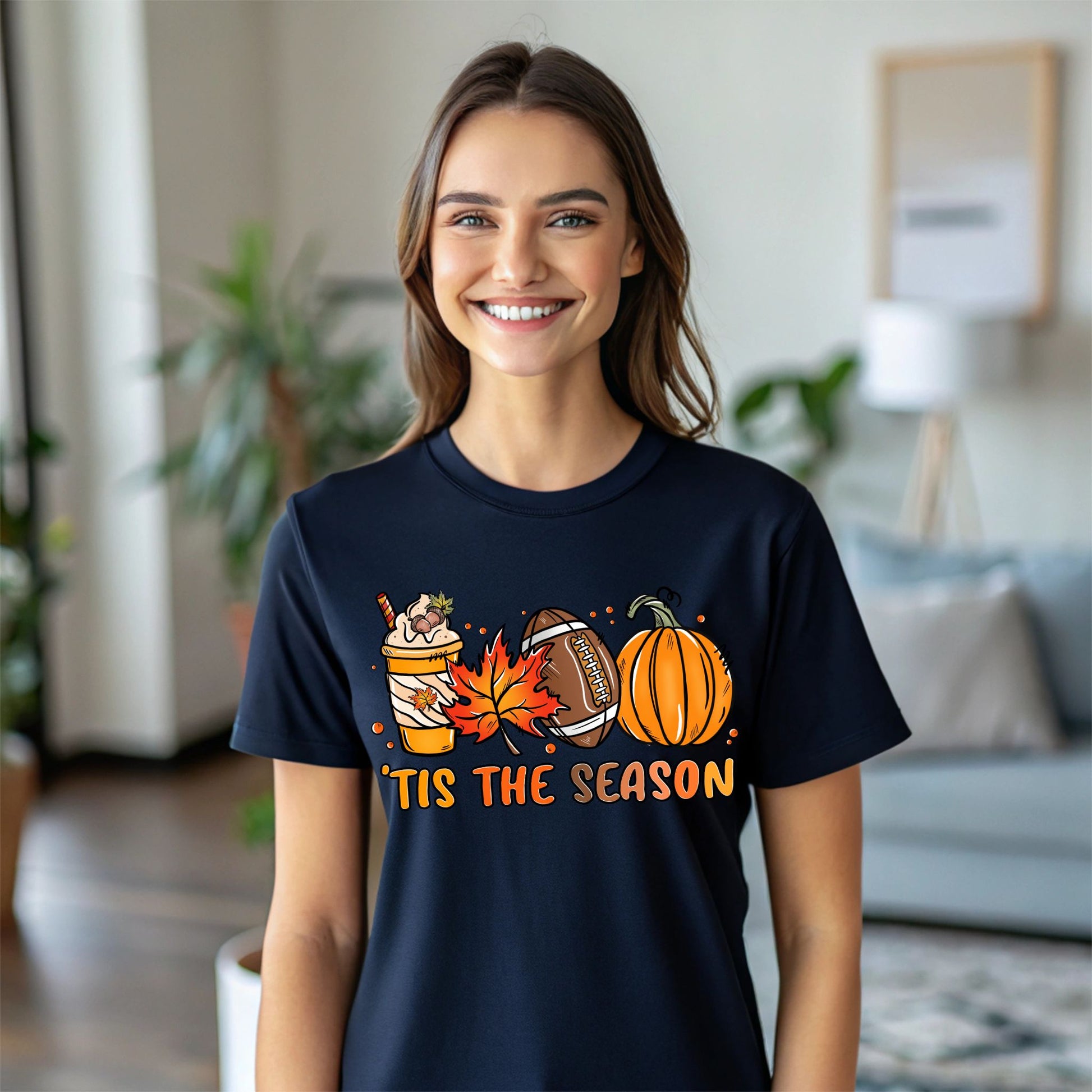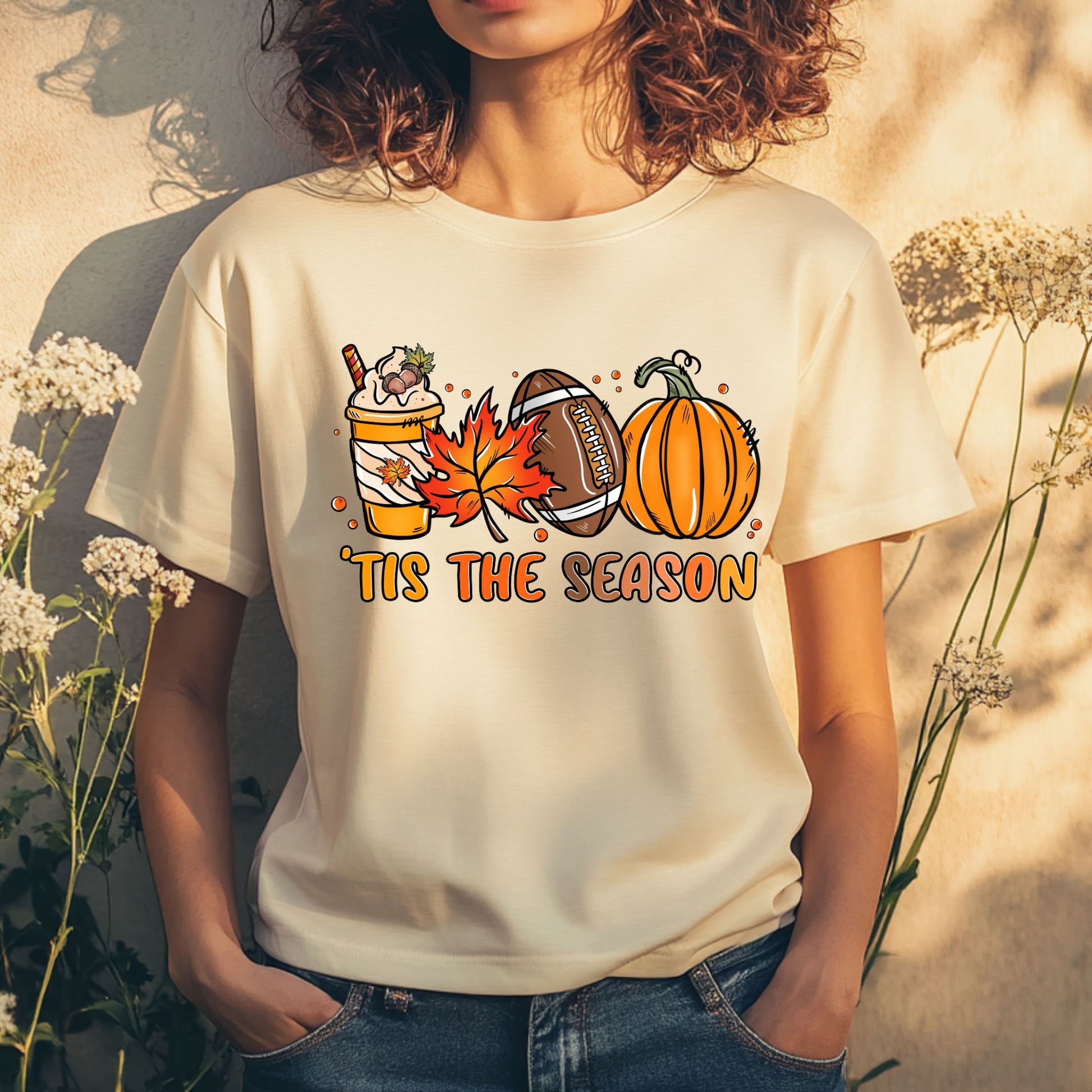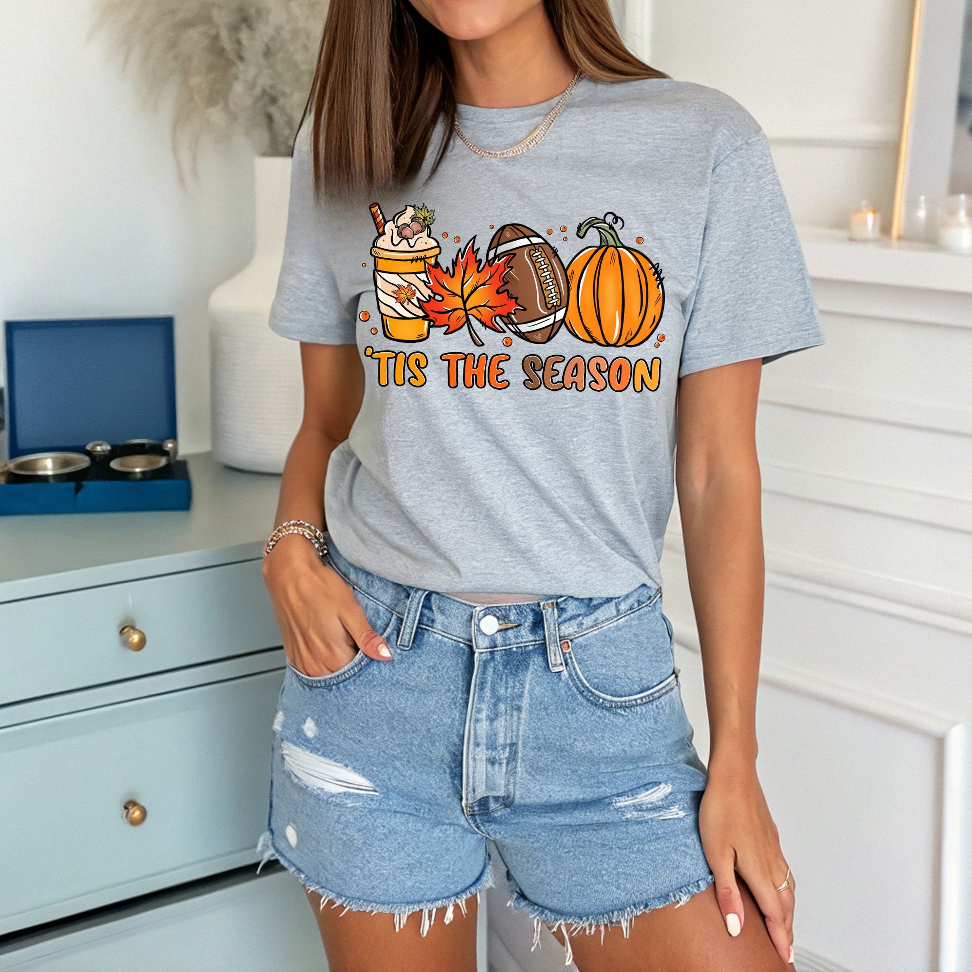 Embrace the magic of the season with our Tis The Season Shirt, a perfect blend of warmth, style, and festive cheer. Expertly handcrafted, this Game Day tee features a charming graphic of a pumpkin spice coffee, a fall leaf, a classic football, and a charming pumpkin, all surrounding the spirited text, "tis the season". This Pumpkin Spice shirt is not just a garment, it's a celebration of all things Fall! But what sets this Coffee Tshirt apart is its unique design. The playful yet sophisticated graphics perfectly capture the essence of fall, from the warmth of a pumpkin spice coffee to the excitement of the football season. It's an ideal pick for a coffee lover gift or for anyone who loves to express their love for the Autumn season in their attire. Wear it to a football game, a pumpkin patch visit, or simply while enjoying a warm cup of coffee on a crisp fall morning. Perfect for football fans, pumpkin spice lovers, and anyone who adores the magic of autumn, this cozy and playful shirt is great for tailgates, fall festivals, game days, or casual autumn outings. Show off your love for football and fall with this must-have seasonal tee!