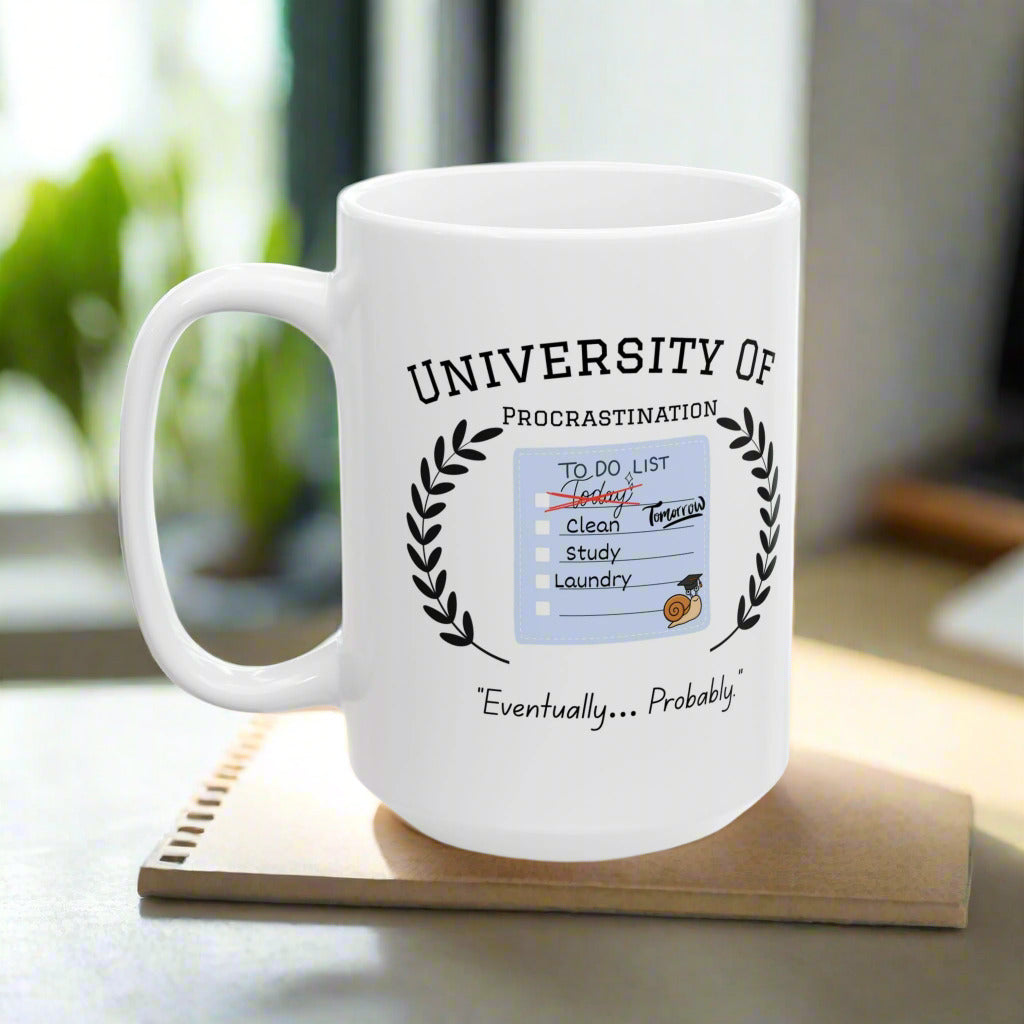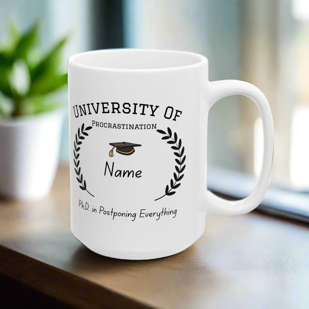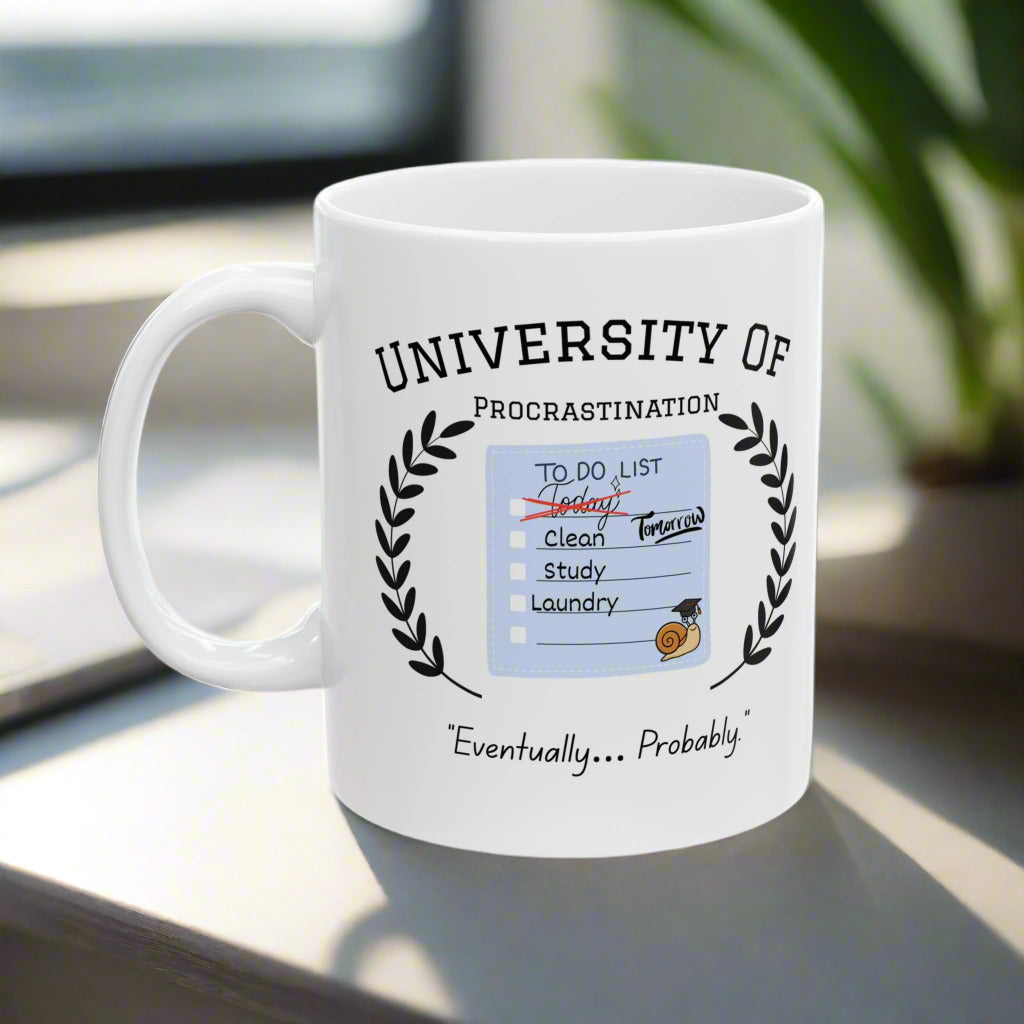 Celebrate your “Eventually… Probably” lifestyle with our University of Procrastination Mug — the ultimate tribute to productive delay! One side features a hilarious to-do list that’s forever rescheduled, complete with a snail in a graduation cap. The other side can be personalized with a name and a tongue-in-cheek degree: Ph.D. in Postponing Everything.