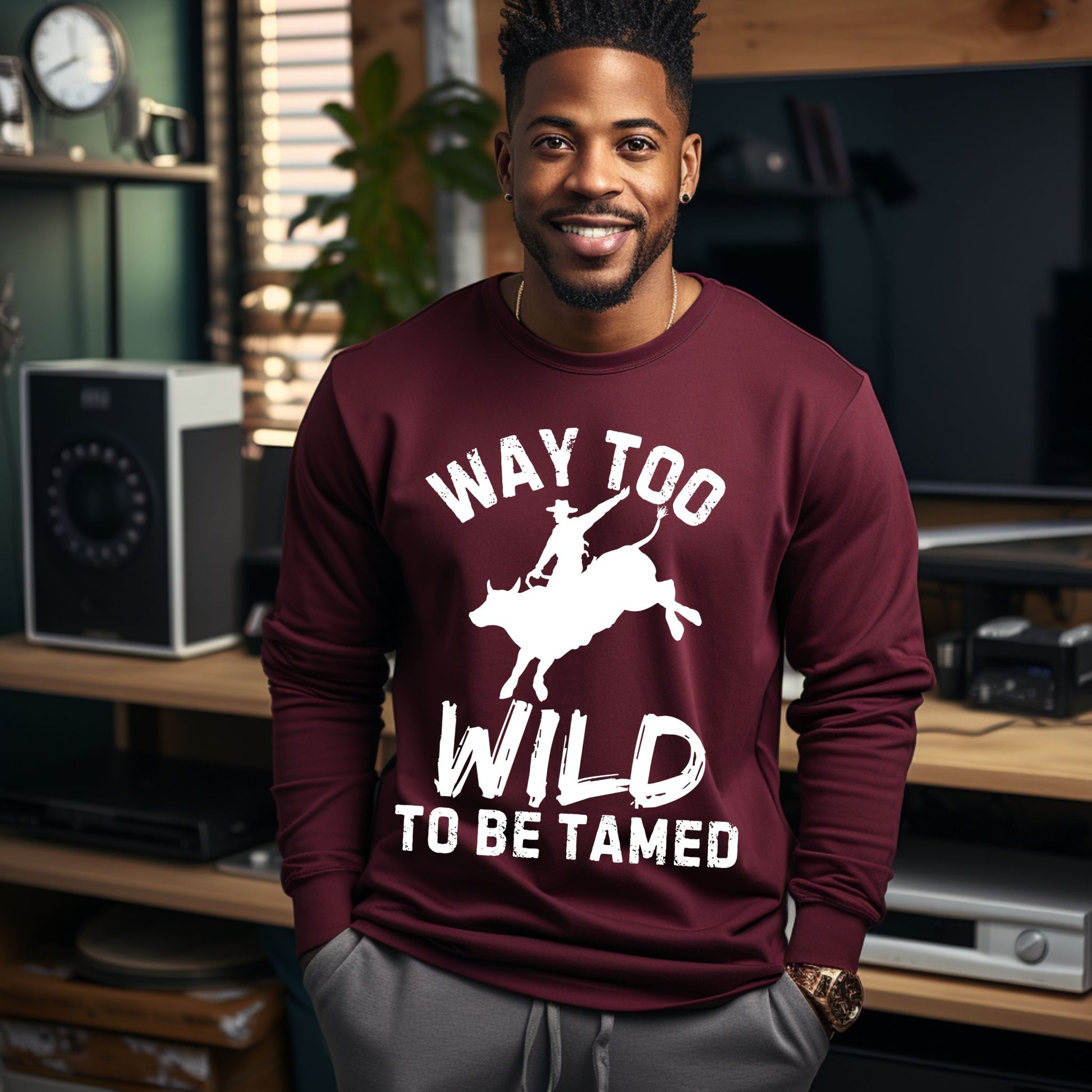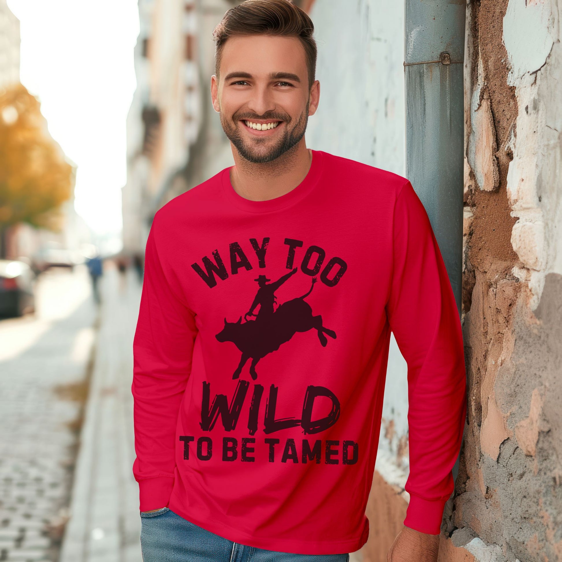 Unleash your inner cowboy spirit with this "Way Too Wild To Be Tamed" Rodeo Lomg Sleeved T-Shirt. Featuring a bold graphic of a cowboy riding a bucking bull, this western-themed tee captures the wild and fearless energy of the rodeo. Perfect for rodeo fans, country music lovers, and anyone with a free spirit, this t-shirt combines rugged style with comfort. Made from high-quality, breathable cotton, it’s ideal for casual days, rodeo events, country festivals, or as a standout gift for the cowboy or cowgirl in your life.